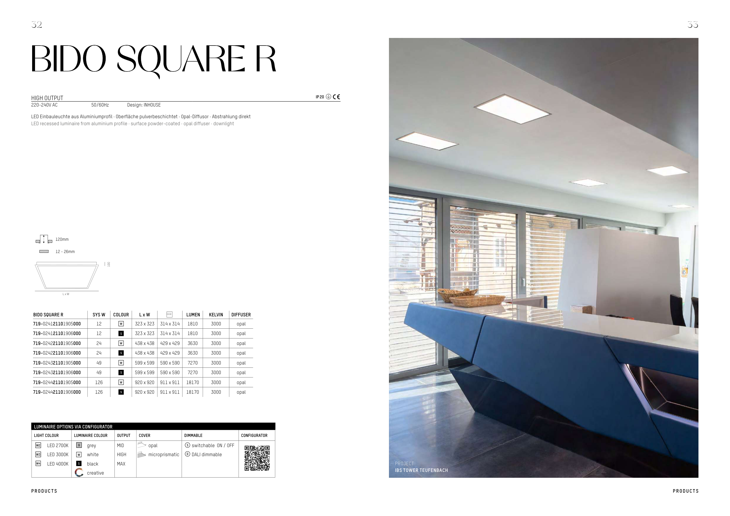 LED recessed luminaire from aluminium profile · surface powder-coated · opal diffuser · downlight