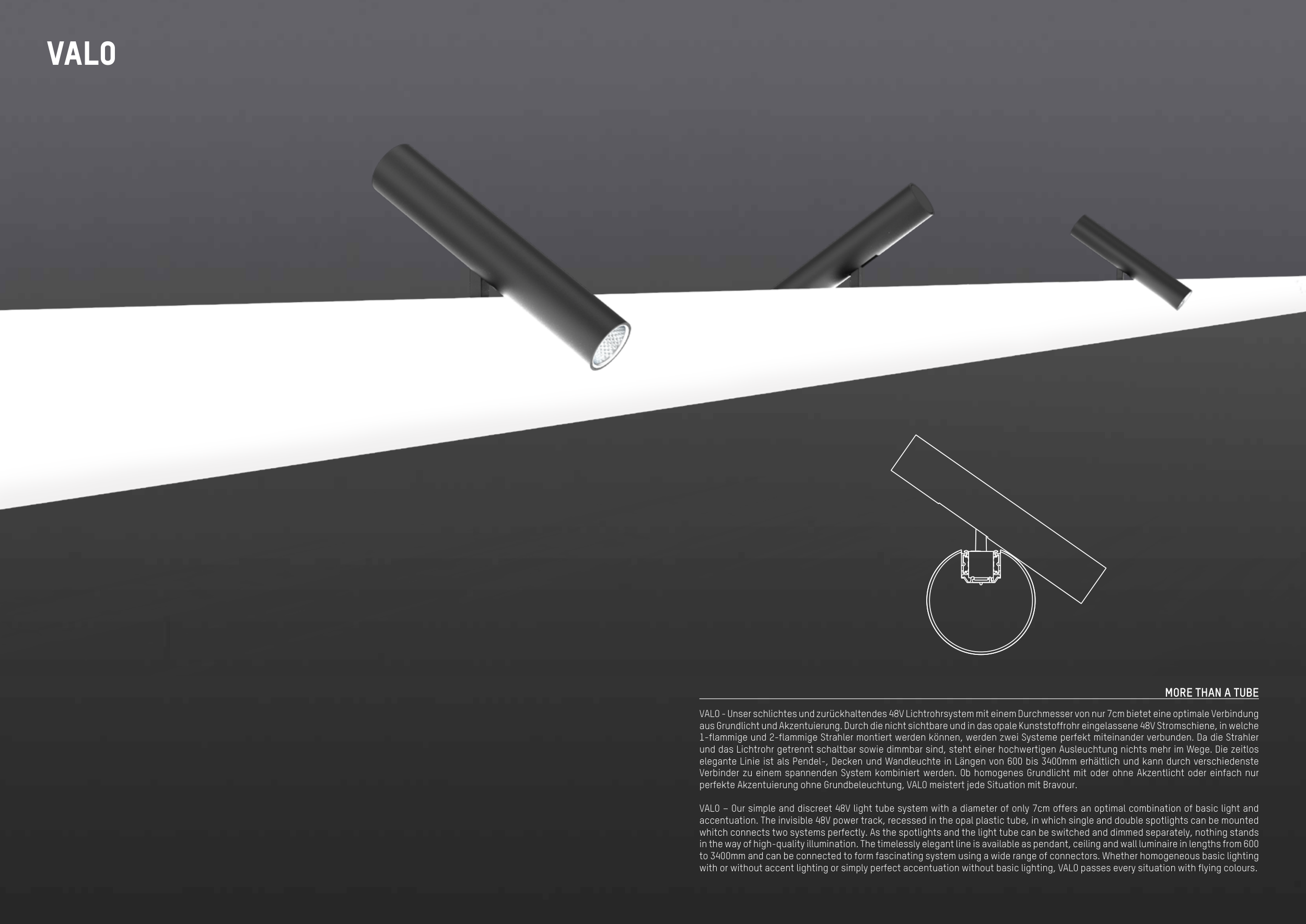 VALO – Our simple and discreet 48V light tube system with a diameter of only 7cm offers an optimal combination of basic light and