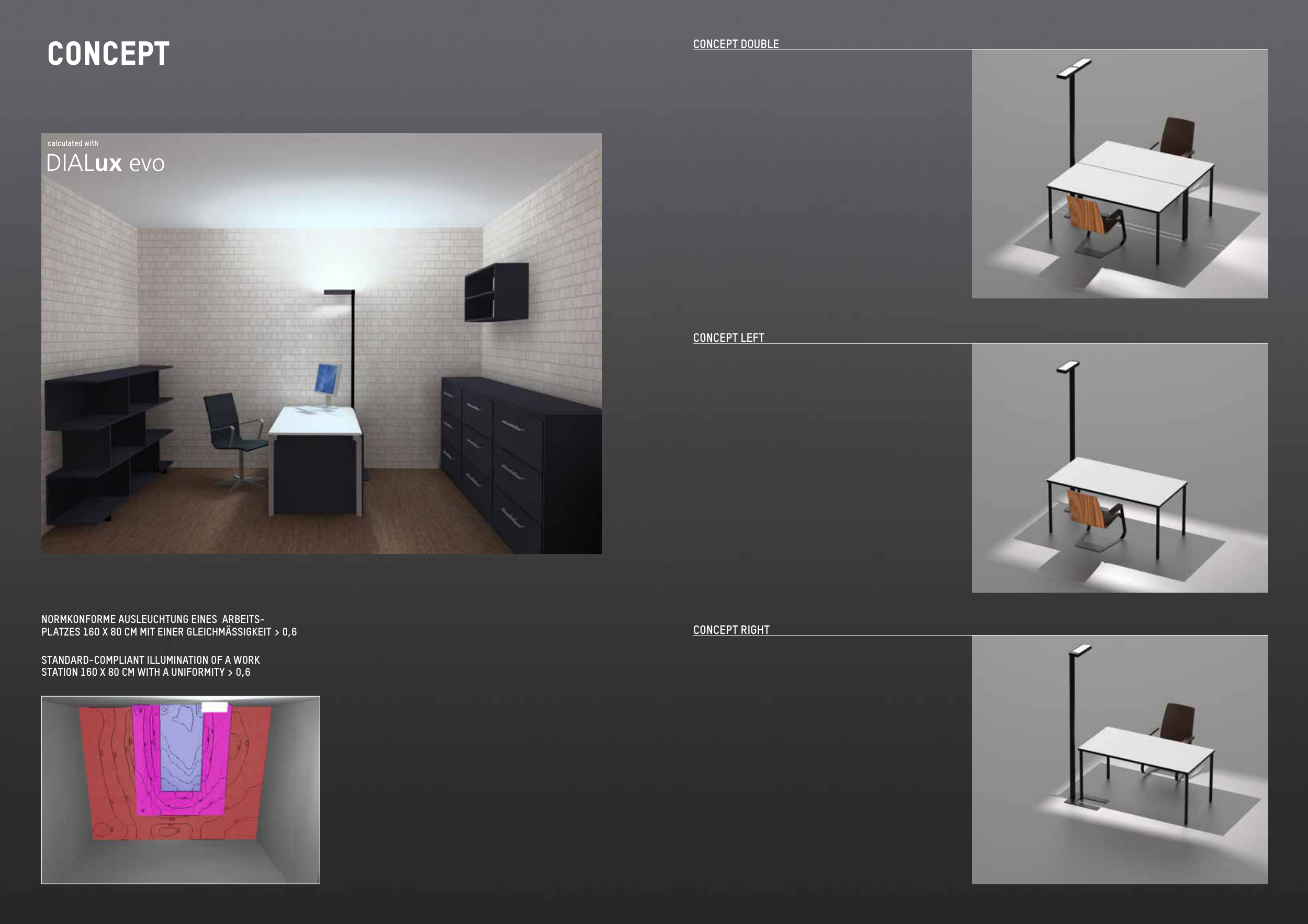 CONCEPT DOUBLE CONCEPT LEFT CONCEPT RIGHT calculated with DIALux evo CONCEPT NORMKONFORME AUSLEUCHTUNG EINES ARBEITS- PLATZES 160 X 80 CM MIT EINER GLEICHMÄSSIGKEIT > 0,6 STANDARD-COMPLIANT ILLUMINATION OF A WORK STATION 160 X 80 CM WITH A UNIFORMITY > 0,6