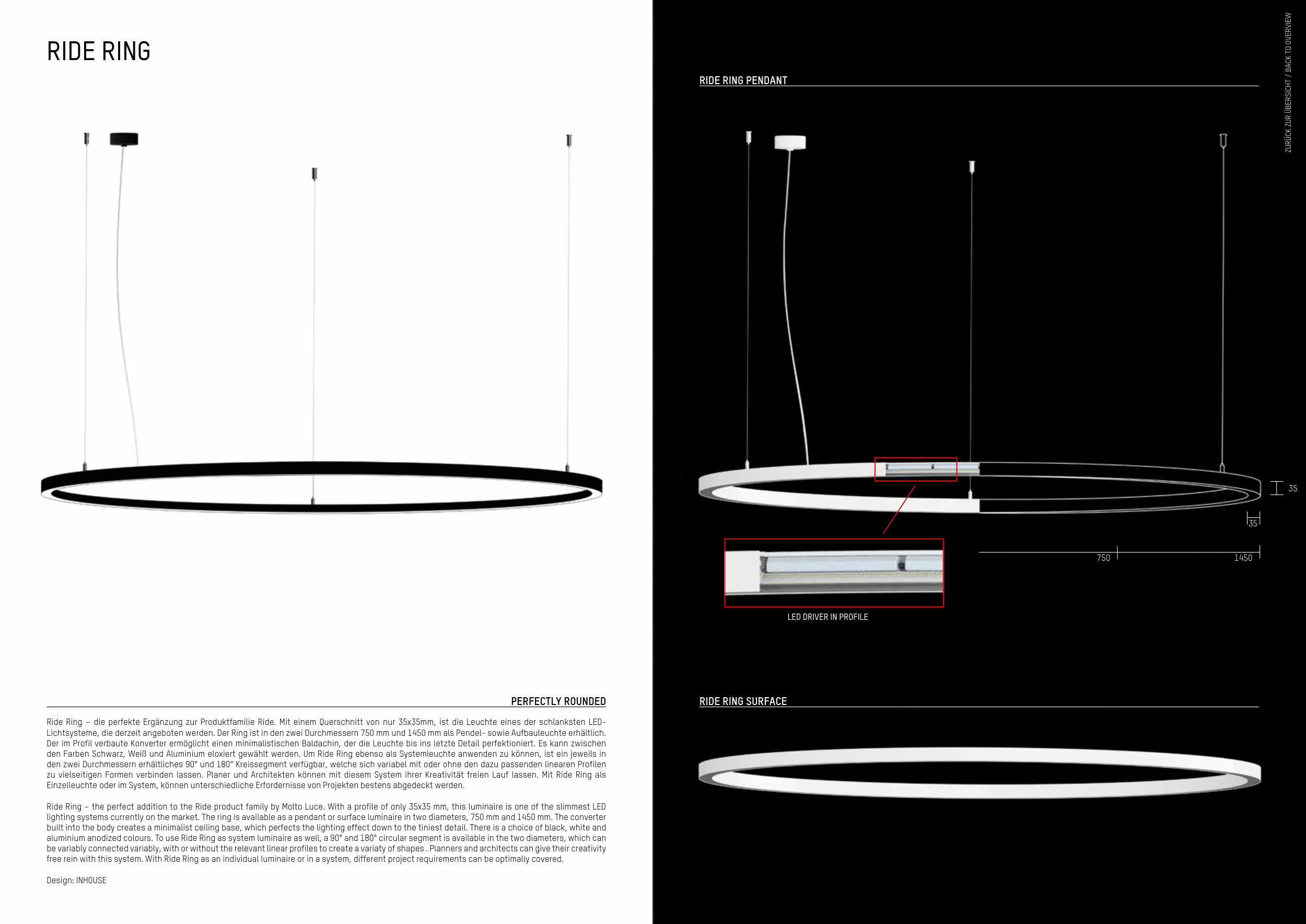 Lichtsysteme, die derzeit angeboten werden. Der Ring ist in den zwei Durchmessern 750 mm und 1450 mm als Pendel- sowie Aufbauleuchte erhältlich.