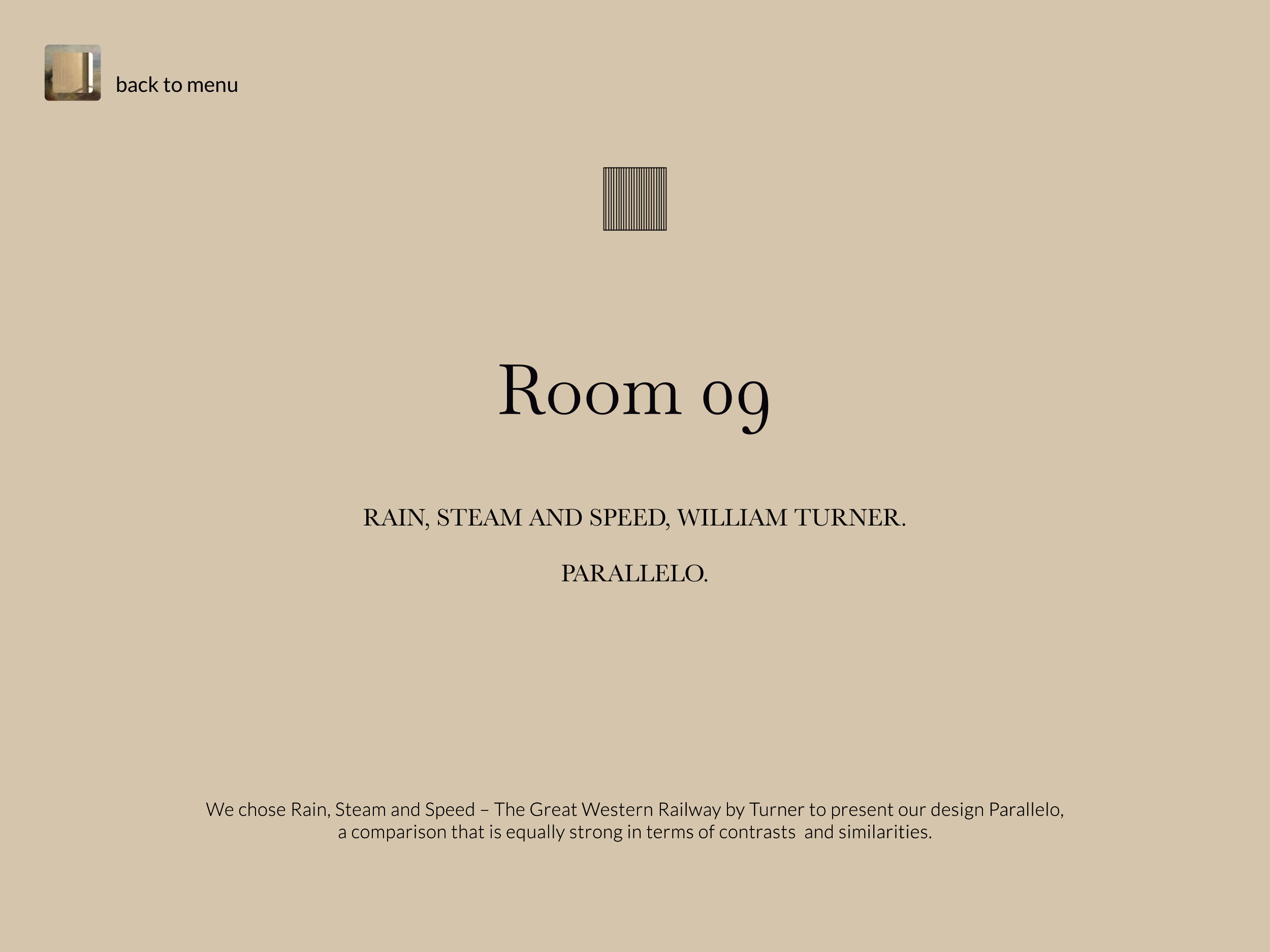 We chose Rain, Steam and Speed – The Great Western Railway by Turner to present our design Parallelo, a comparison that is equally strong in terms of contrasts and similarities. back to menu