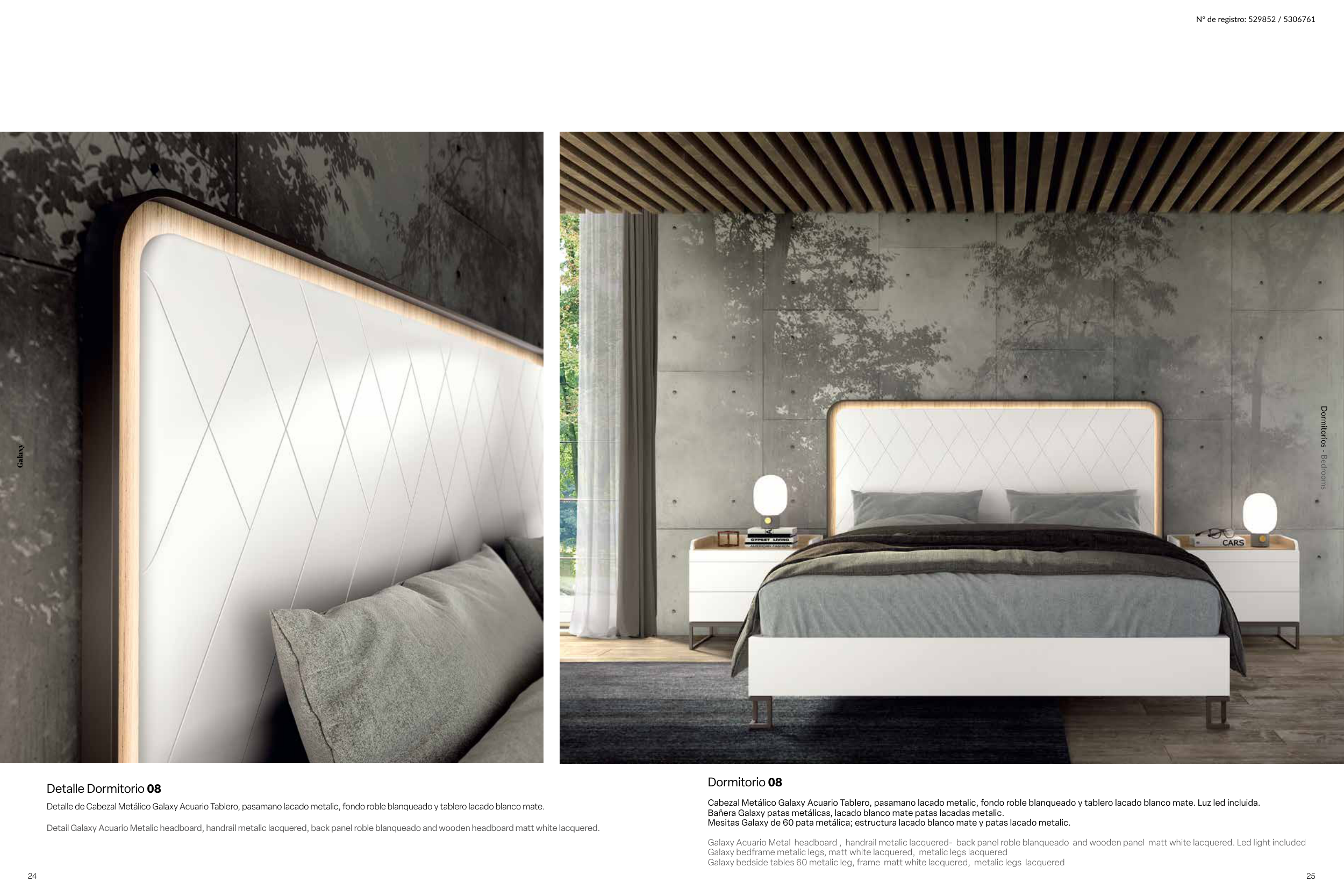 Galaxy Acuario Metal headboard , handrail metalic lacquered- back panel roble blanqueado and wooden panel matt white lacquered. Led light included