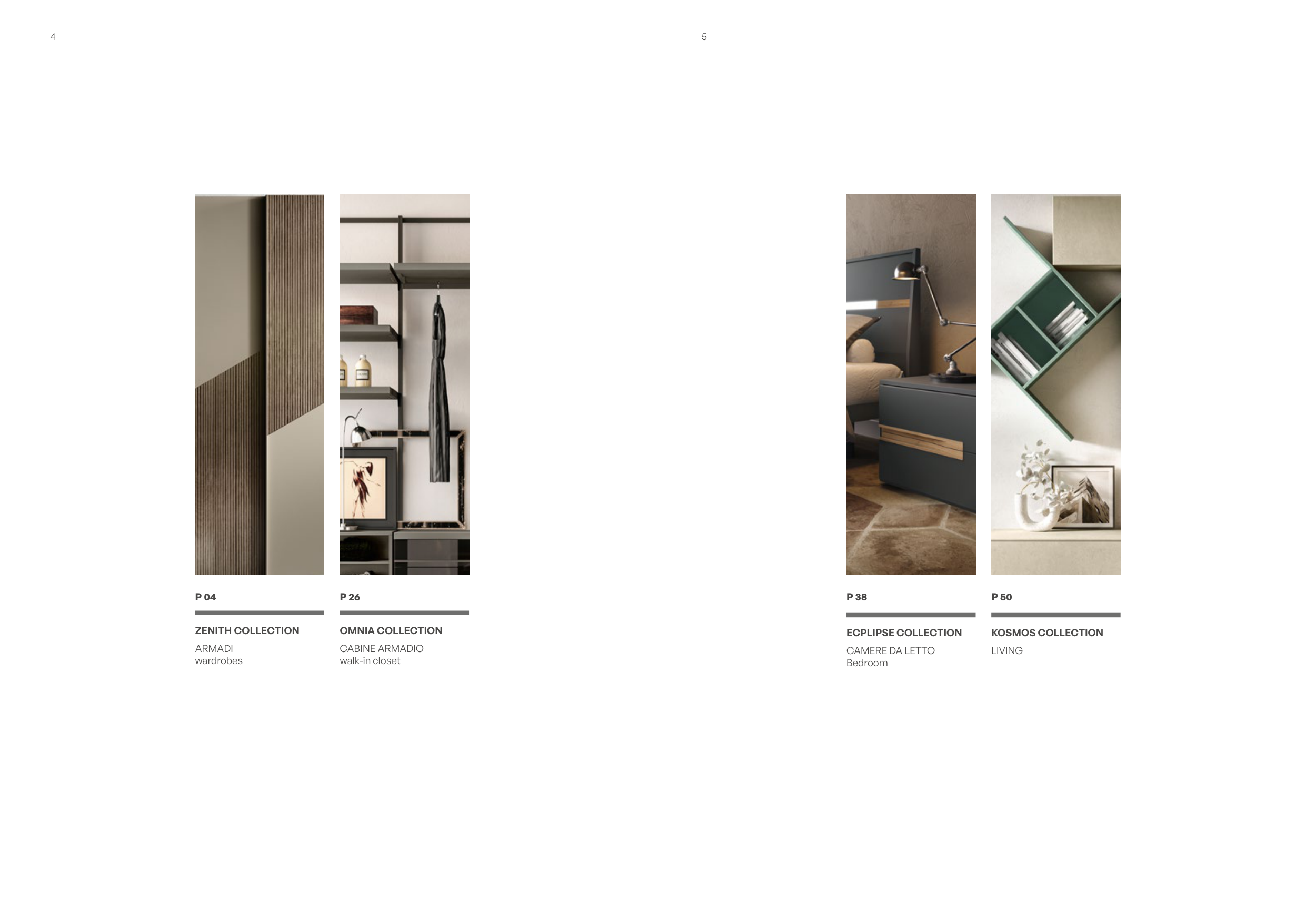 4 5 ZENITH COLLECTION ARMADI wardrobes P 04 P 38 ECPLIPSE COLLECTION CAMERE DA LETTO Bedroom P 26 OMNIA COLLECTION CABINE ARMADIO walk-in closet P 50 KOSMOS COLLECTION LIVING
