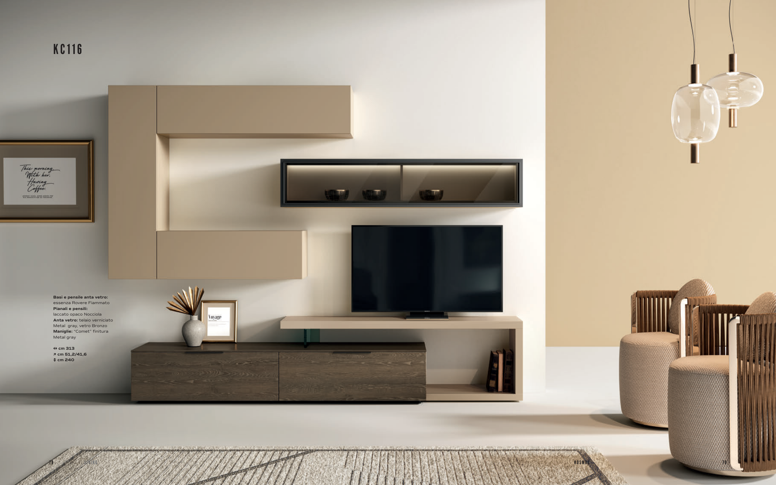 KC 116 Basi e pensile anta vetro: essenza Rovere Fiammato Pianali e pensili: laccato opaco Nocciola Anta vetro: telaio verniciato Metal gray, vetro Bronzo Maniglie: “Comet” finitura Metal gray ↔ cm 313 ↗ cm 51,2/41,6 ↕ cm 240 KOSMOS 78 79 . LIVING