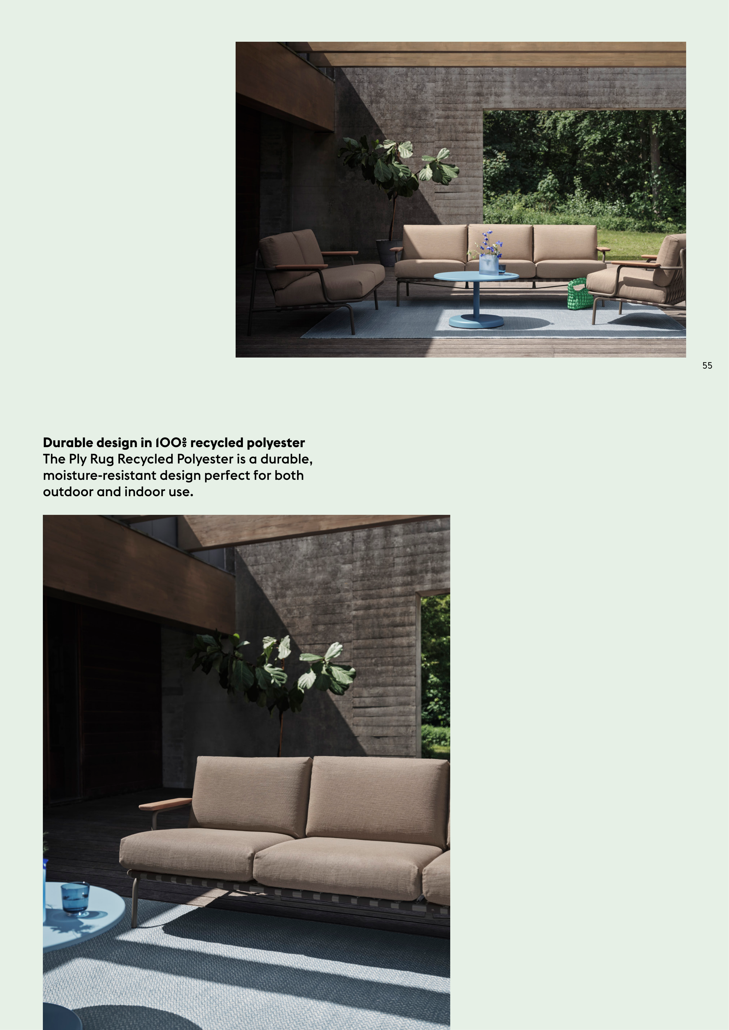 55 Durable design in 100% recycled polyester The Ply Rug Recycled Polyester is a durable, moisture-resistant design perfect for both outdoor and indoor use.