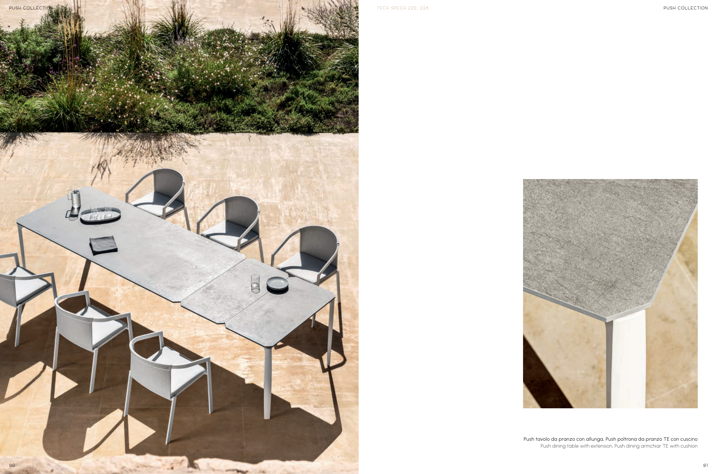 90 PUSH COLLECTION EXTRAORDINARY Push tavolo da pranzo con allunga, Push poltrona da pranzo TE con cuscino Push dining table with extension, Push dining armchiar TE with cushion 91 PUSH COLLECTION TECH SPECH 220, 228