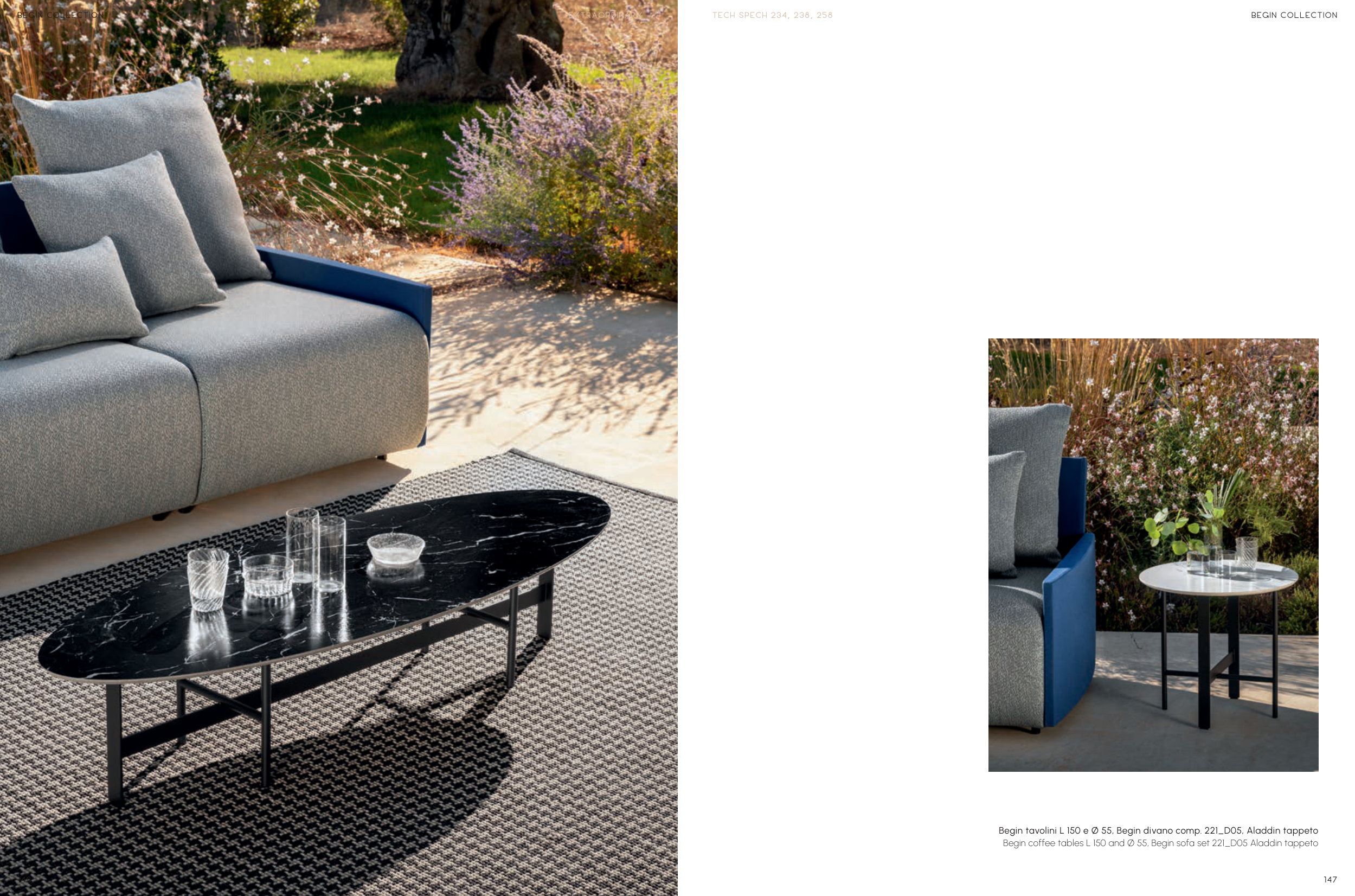 146 BEGIN COLLECTION EXTRAORDINARY 147 BEGIN COLLECTION TECH SPECH 234, 238, 258 Begin tavolini L 150 e Ø 55, Begin divano comp. 221_D05, Aladdin tappeto Begin coffee tables L 150 and Ø 55, Begin sofa set 221_D05 Aladdin tappeto