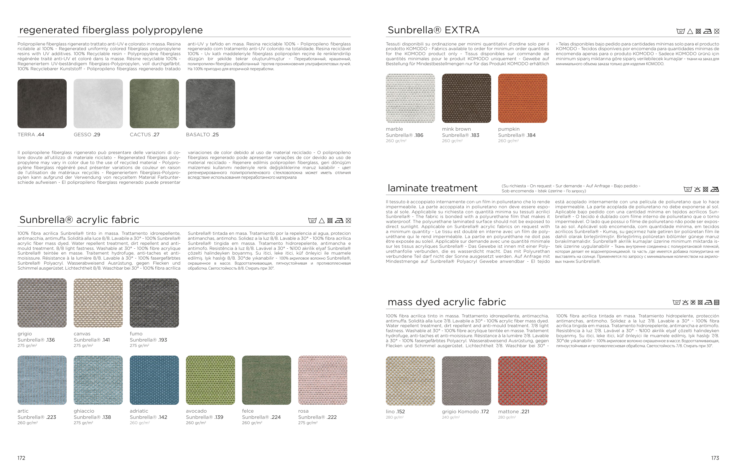 100% fibra acrilica Sunbrella® tinto in massa. Trattamento idrorepellente,