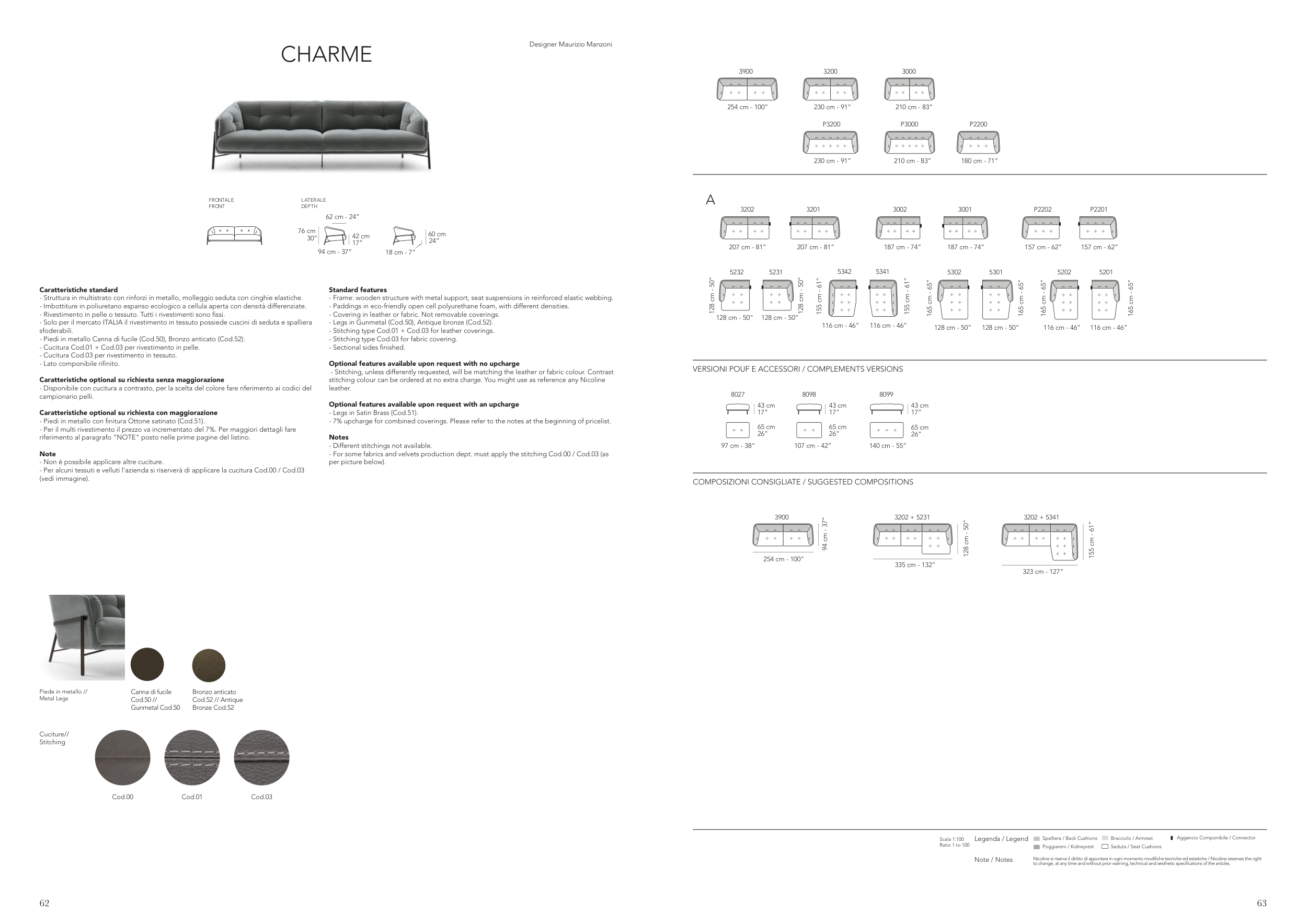- Per alcuni tessuti e velluti l’azienda si riserverà di applicare la cucitura Cod.00 / Cod.03