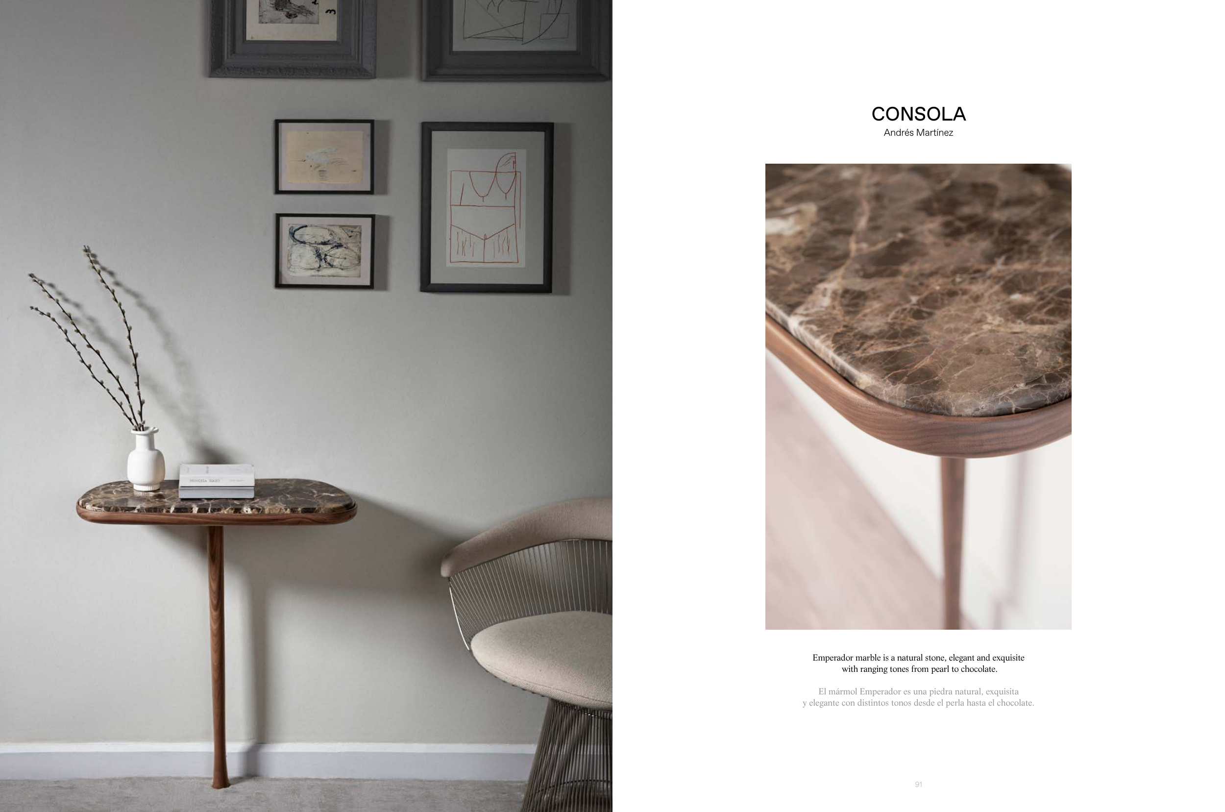 90 91 Emperador marble is a natural stone, elegant and exquisite with ranging tones from pearl to chocolate. El mármol Emperador es una piedra natural, exquisita y elegante con distintos tonos desde el perla hasta el chocolate. CONSOLA Andrés Martínez