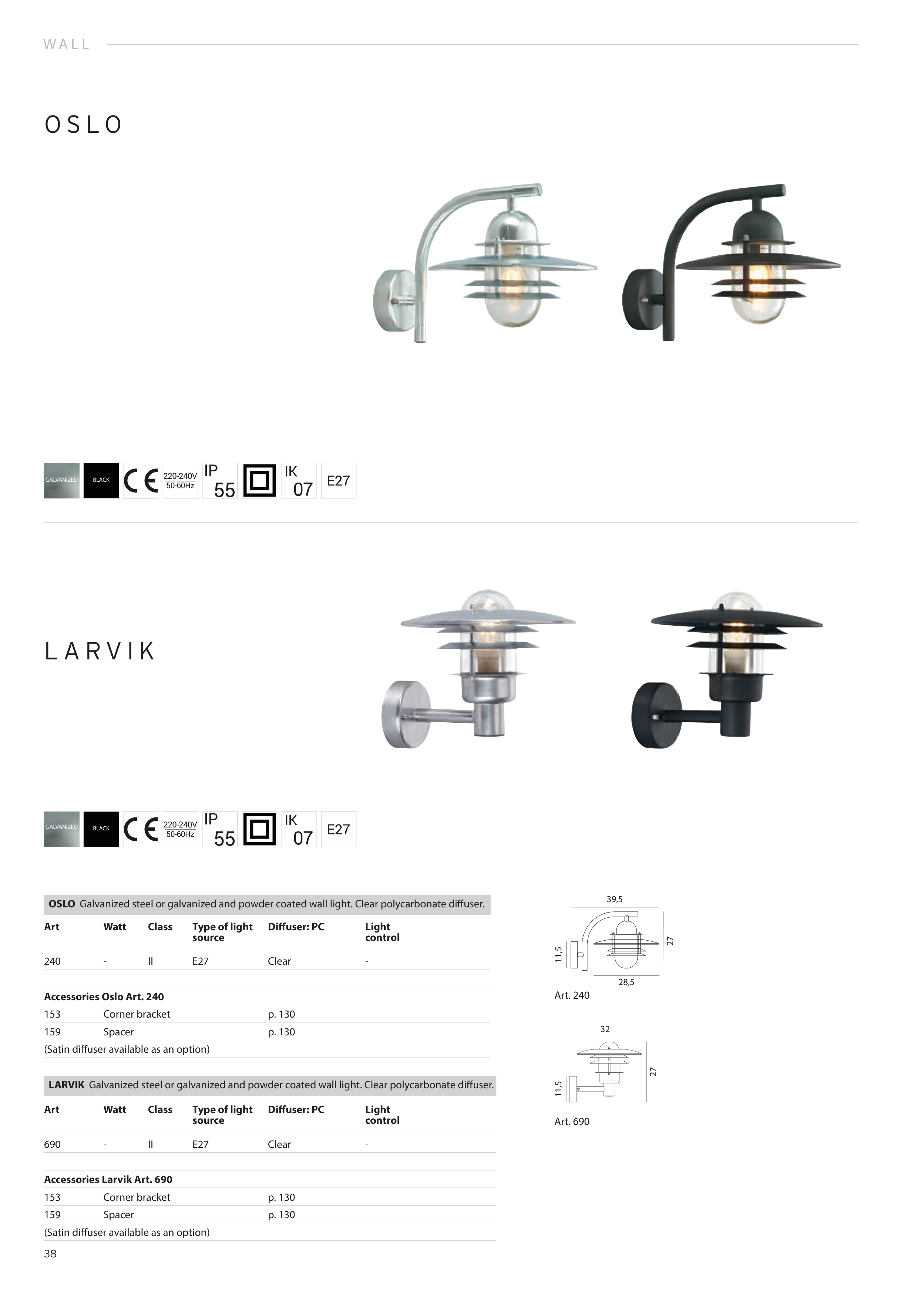 LARVIK Galvanized steel or galvanized and powder coated wall light. Clear polycarbonate diffuser.