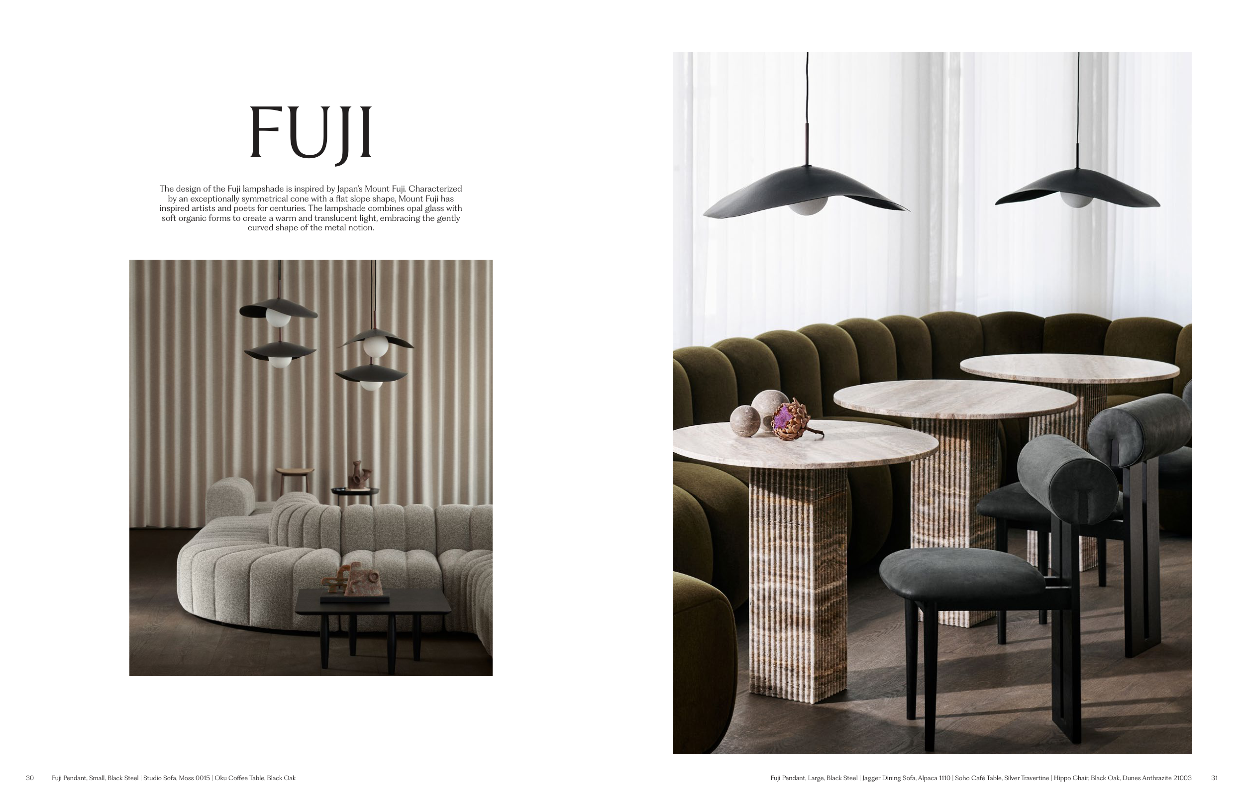 Fuji Pendant, Large, Black Steel | Jagger Dining Sofa, Alpaca 1110 | Soho Café Table, Silver Travertine | Hippo Chair, Black Oak, Dunes Anthrazite 21003