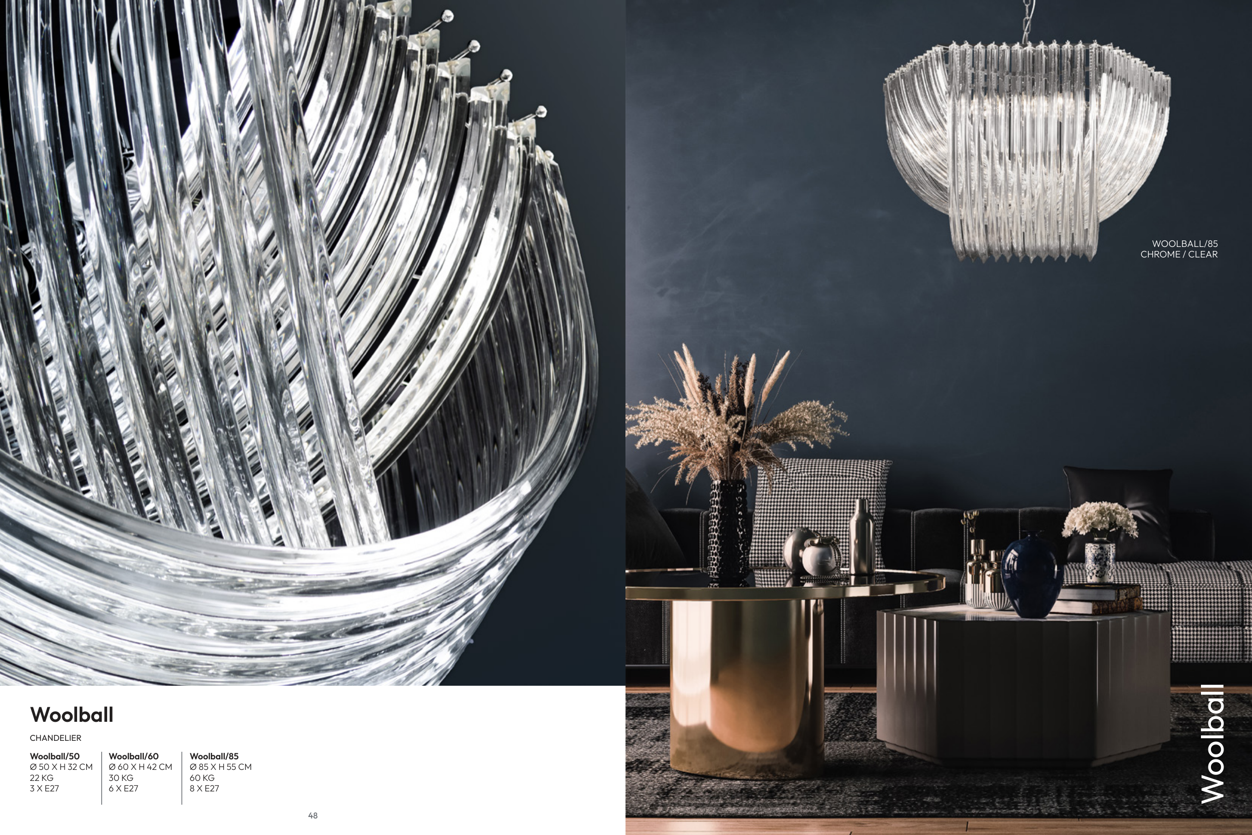 48 Woolball/60 Ø 60 X H 42 CM 30 KG 6 X E27 Woolball/50 Ø 50 X H 32 CM 22 KG 3 X E27 Woolball/85 Ø 85 X H 55 CM 60 KG 8 X E27 CHANDELIER Woolball Woolball WOOLBALL/85 CHROME / CLEAR