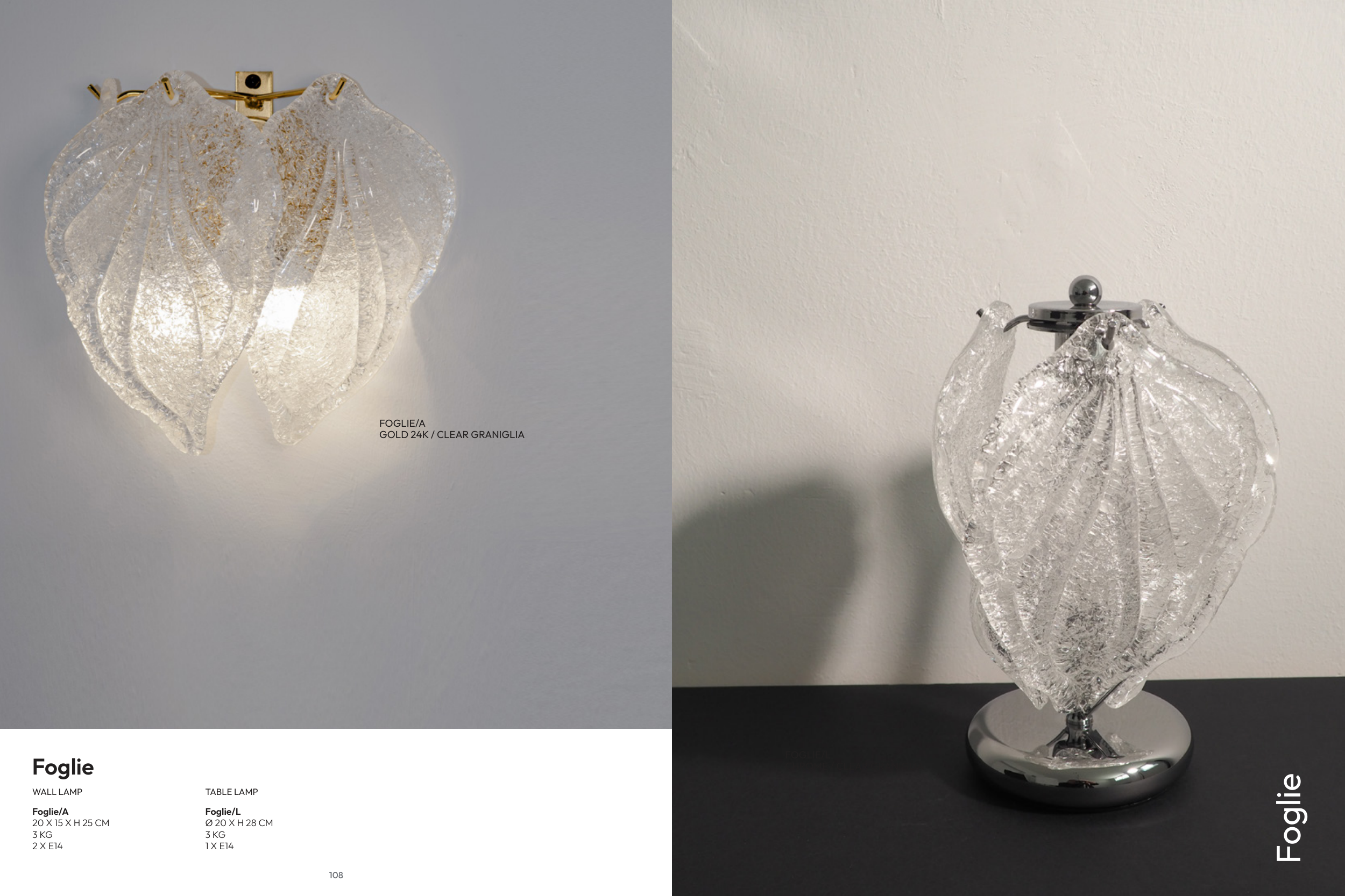 108 FOGLIE/A GOLD 24K / CLEAR GRANIGLIA Foglie/A 20 X 15 X H 25 CM 3 KG 2 X E14 WALL LAMP Foglie TABLE LAMP Foglie/L Ø 20 X H 28 CM 3 KG 1 X E14 FOGLIE/L CHROME / CLEAR GRANIGLIA Foglie