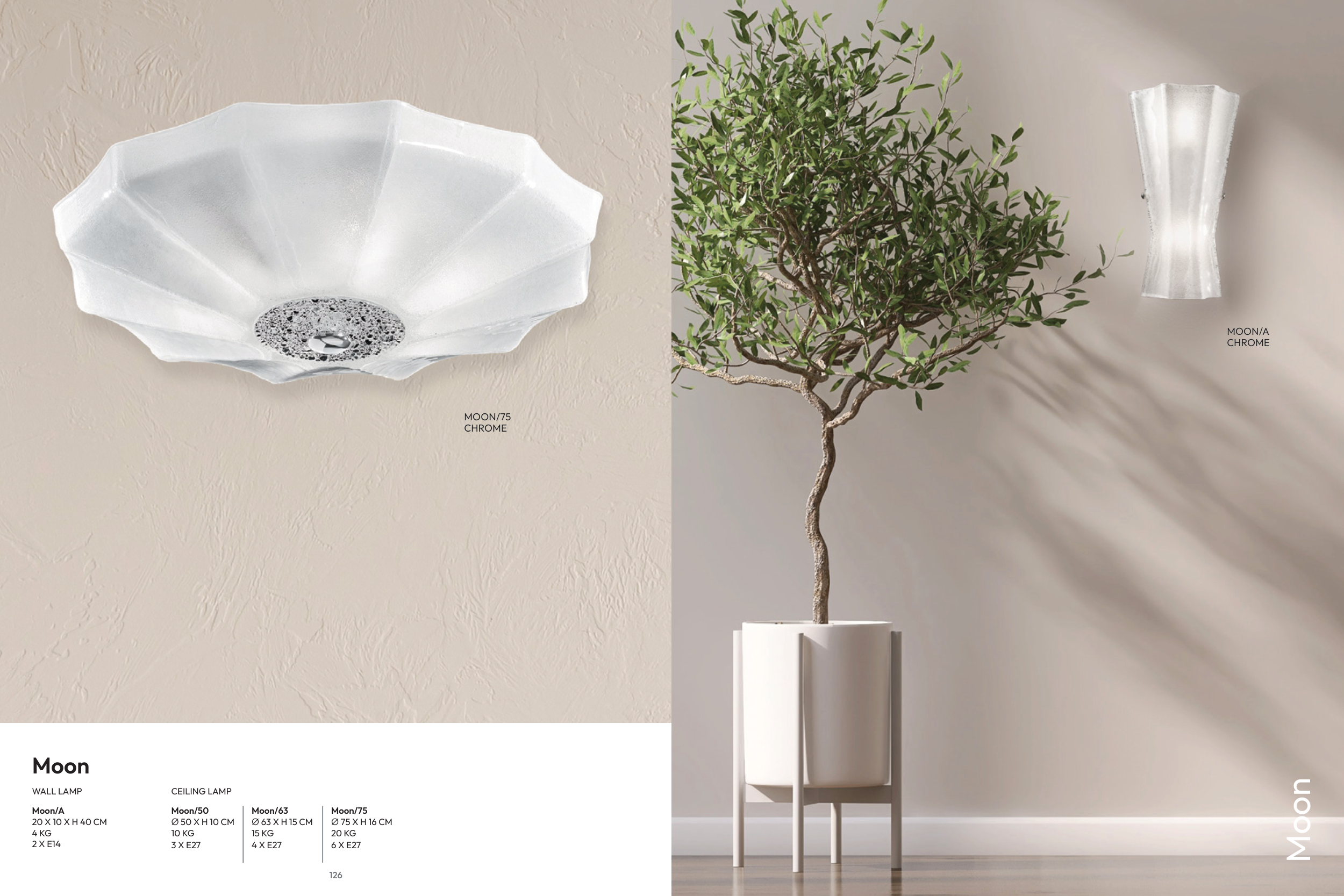 126 Moon/50 Ø 50 X H 10 CM 10 KG 3 X E27 Moon/A 20 X 10 X H 40 CM 4 KG 2 X E14 Moon/63 Ø 63 X H 15 CM 15 KG 4 X E27 Moon/75 Ø 75 X H 16 CM 20 KG 6 X E27 MOON/75 CHROME WALL LAMP Moon CEILING LAMP Moon MOON/A CHROME