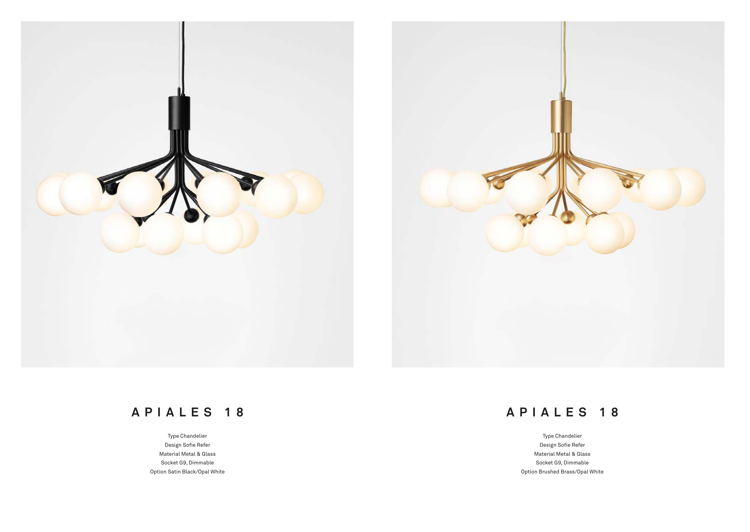 A P I A L E S 1 8 Type Chandelier Design Sofie Refer Material Metal & Glass Socket G9, Dimmable Option Satin Black/Opal White A P I A L E S 1 8 Type Chandelier Design Sofie Refer Material Metal & Glass Socket G9, Dimmable Option Brushed Brass/Opal White