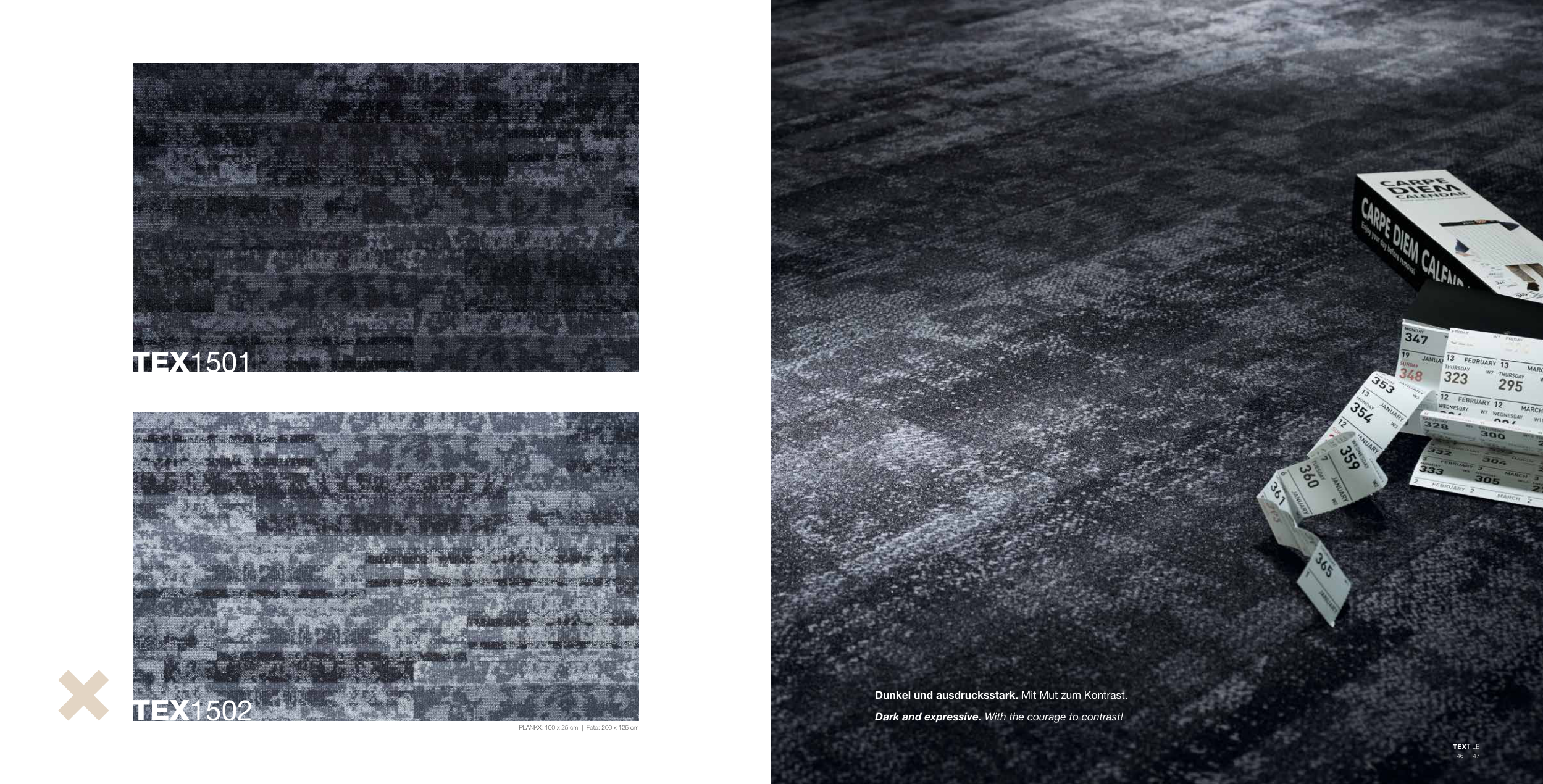 TEX1501 TEX1502 PLANKX: 100 x 25 cm | Foto: 200 x 125 cm Dunkel und ausdrucksstark. Mit Mut zum Kontrast. Dark and expressive. With the courage to contrast!