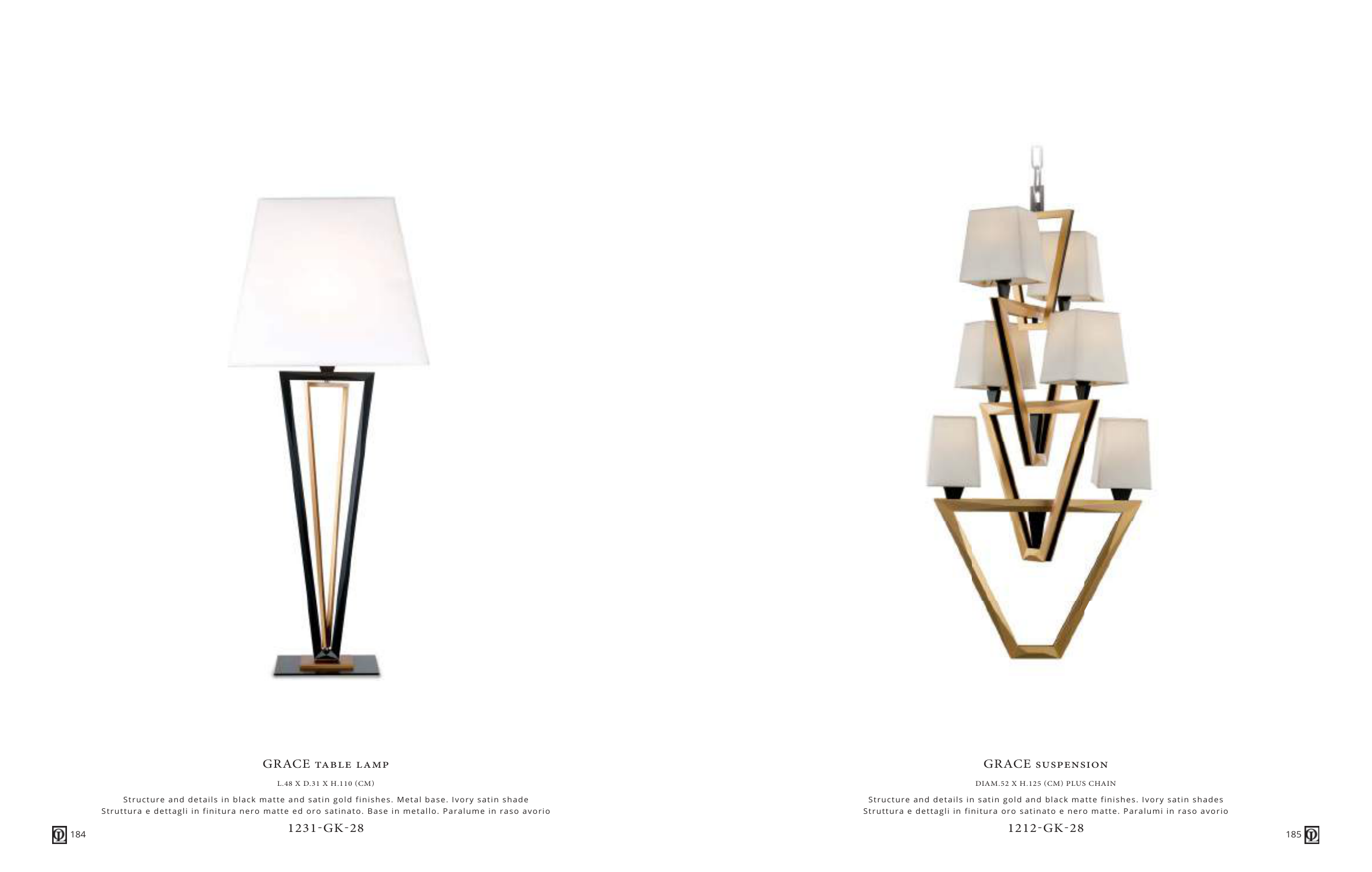 Struttura e dettagli in finitura oro satinato e nero matte. Paralumi in raso avorio