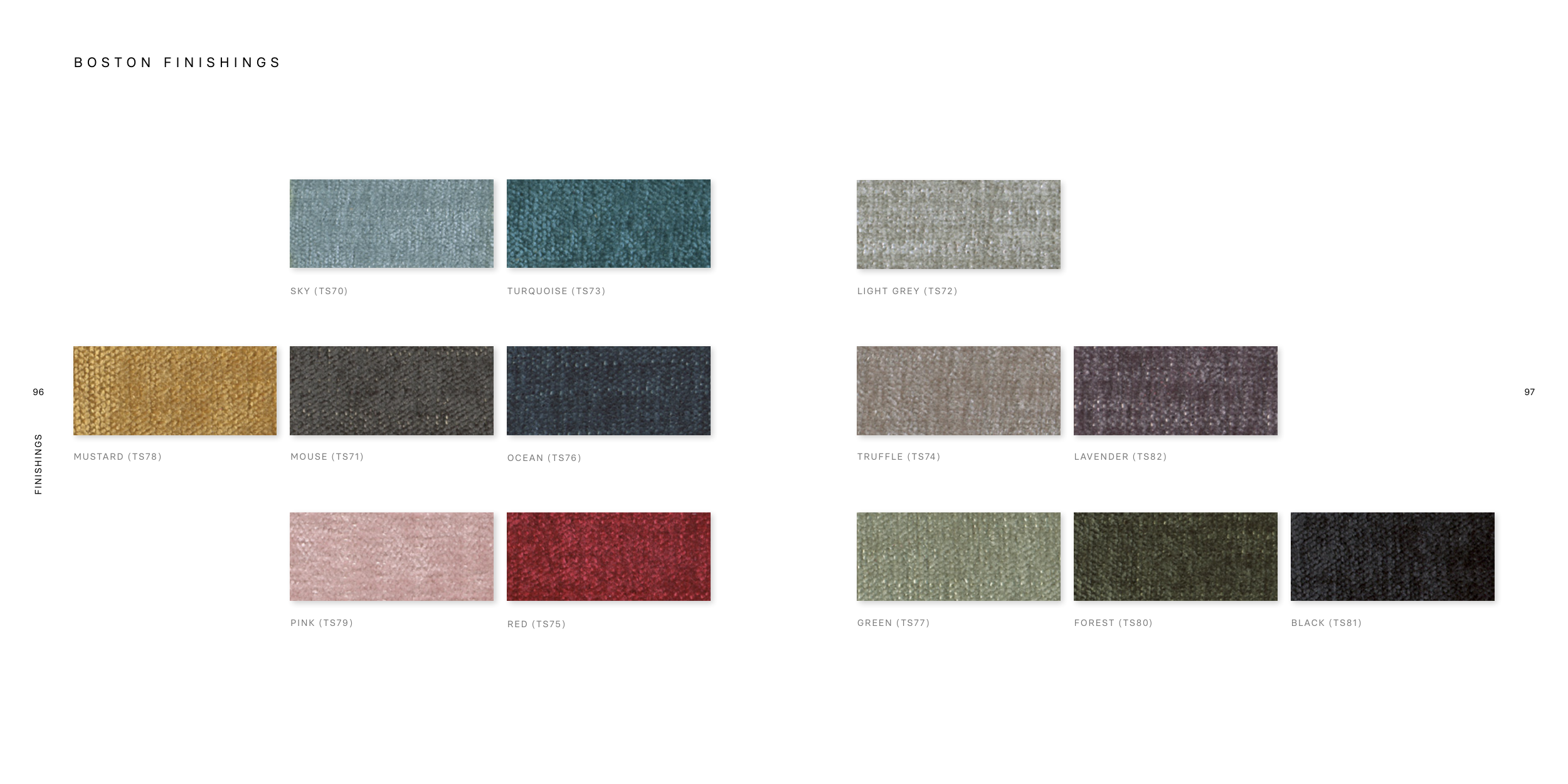 96 97 FINISHINGS SKY (TS70) MUSTARD (TS78) LIGHT GREY (TS72) TRUFFLE (TS74) GREEN (TS77) TURQUOISE (TS73) MOUSE (TS71) PINK (TS79) LAVENDER (TS82) FOREST (TS80) OCEAN (TS76) RED (TS75) BLACK (TS81) B O S T O N F I N I S H I N G S