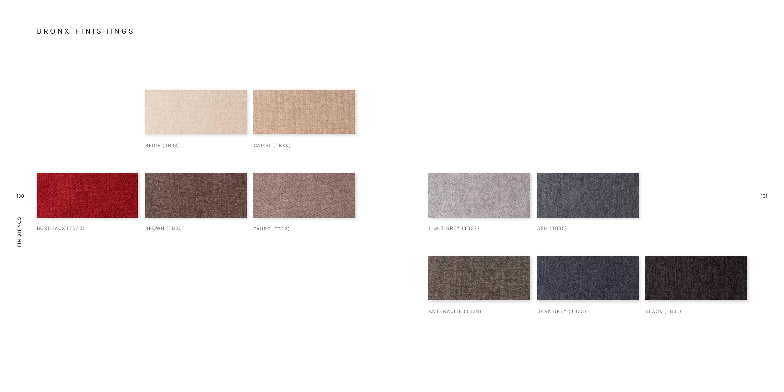 130 131 FINISHINGS BEIGE (TB34) BORDEAUX (TB30) LIGHT GREY (TB37) ANTHRACITE (TB38) CAMEL (TB39) BROWN (TB36) ASH (TB35) DARK GREY (TB33) TAUPE (TB32) BLACK (TB31) B R O N X F I N I S H I N G S