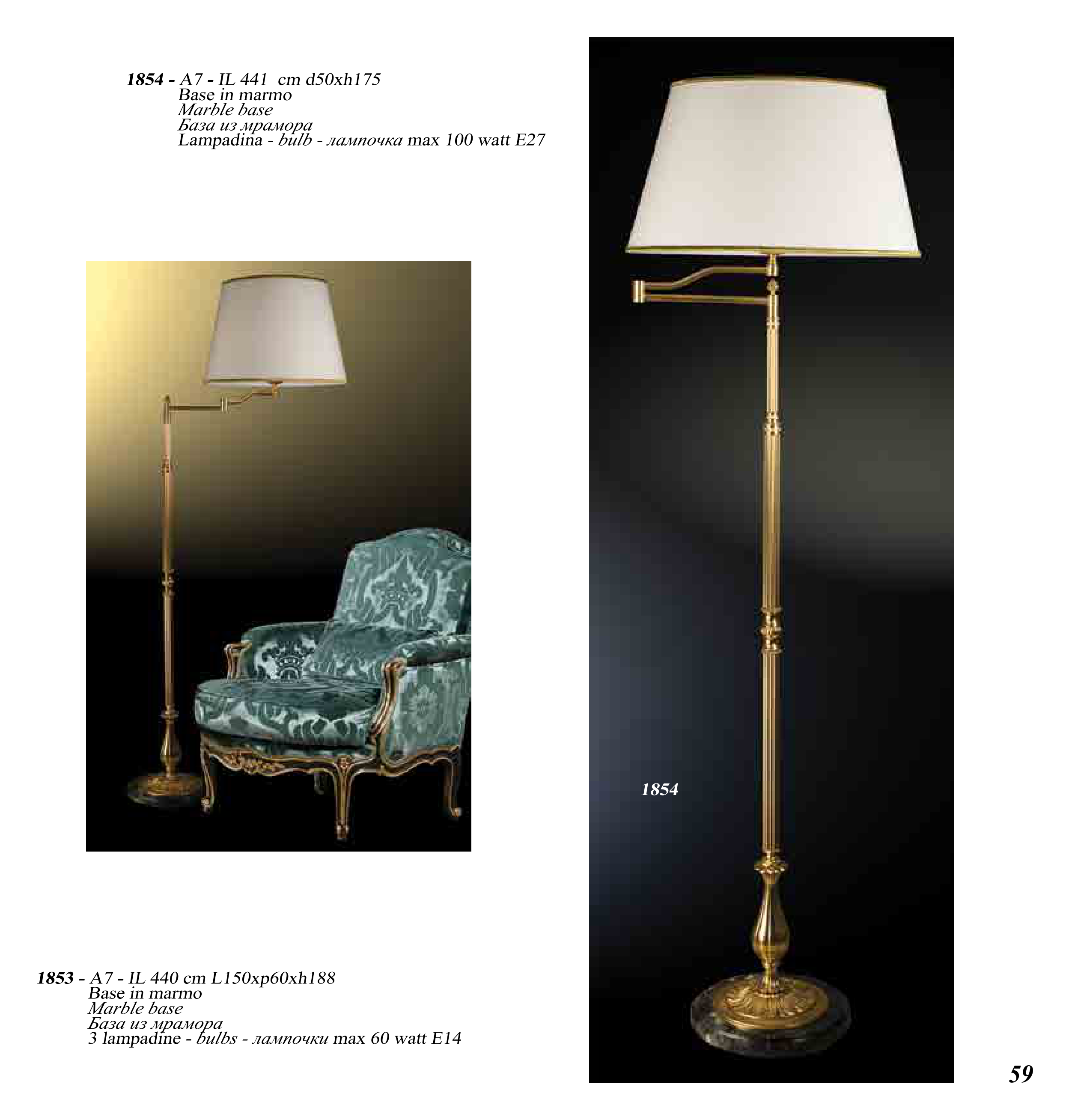59 1854 - A7 - IL 441 cm d50xh175 Base in marmo Marble base База из мрамора Lampadina - bulb - лампочка max 100 watt E27 1854 1853 - A7 - IL 440 cm L150xp60xh188 Base in marmo Marble base База из мрамора 3 lampadine - bulbs - лампочки max 60 watt E14