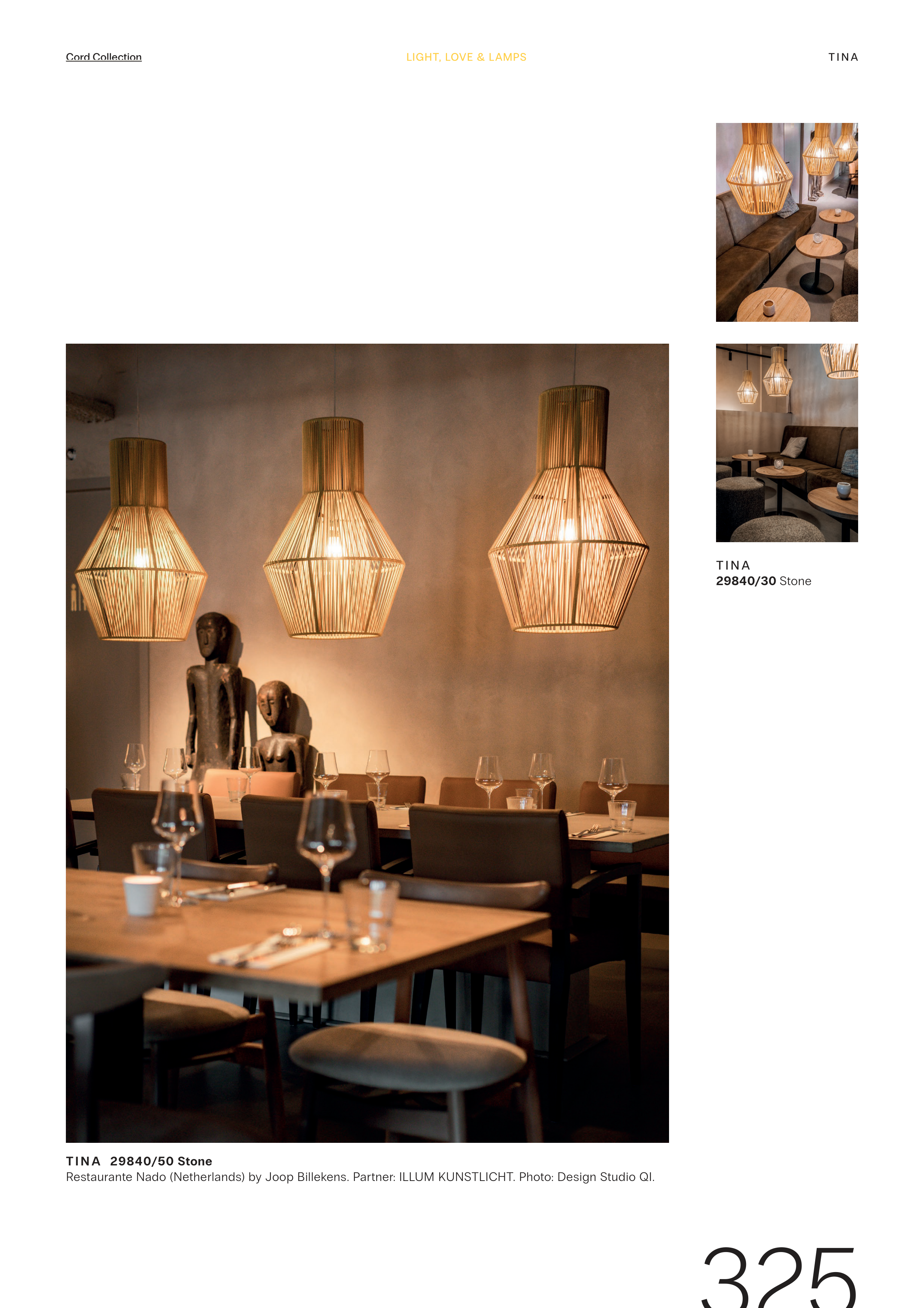 T I N A 29840/30 Stone T I N A 29840/50 Stone Restaurante Nado (Netherlands) by Joop Billekens. Partner: ILLUM KUNSTLICHT. Photo: Design Studio QI. 325 LIGHT, LOVE & LAMPS LIGHT, LOVE & LAMPS T I N A Cord Collection