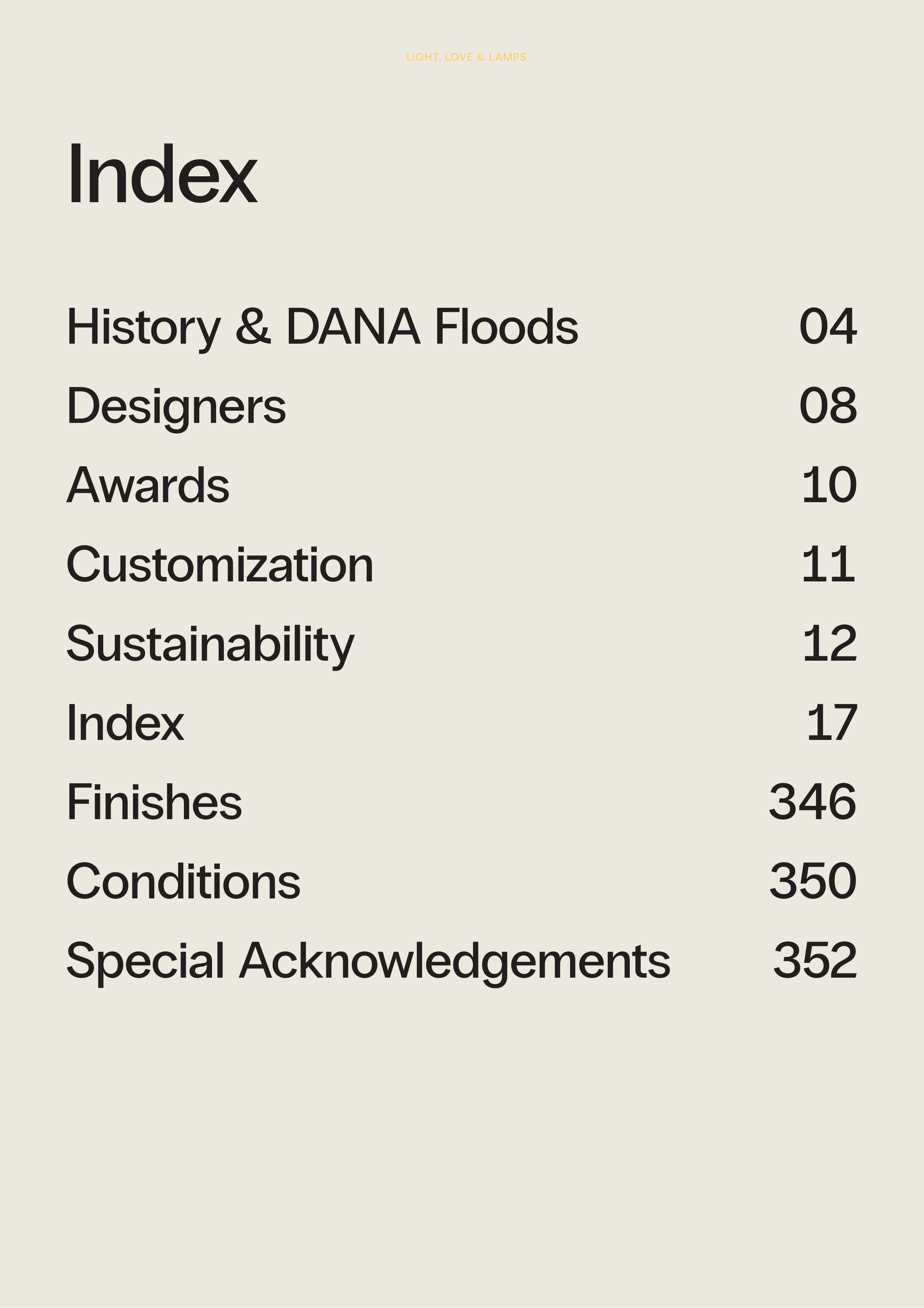 History & DANA Floods 04 Designers 08 Awards 10 Customization 11 Sustainability 12 Index 17 Finishes 346 Conditions 350 Special Acknowledgements 352 Index LIGHT, LOVE & LAMPS