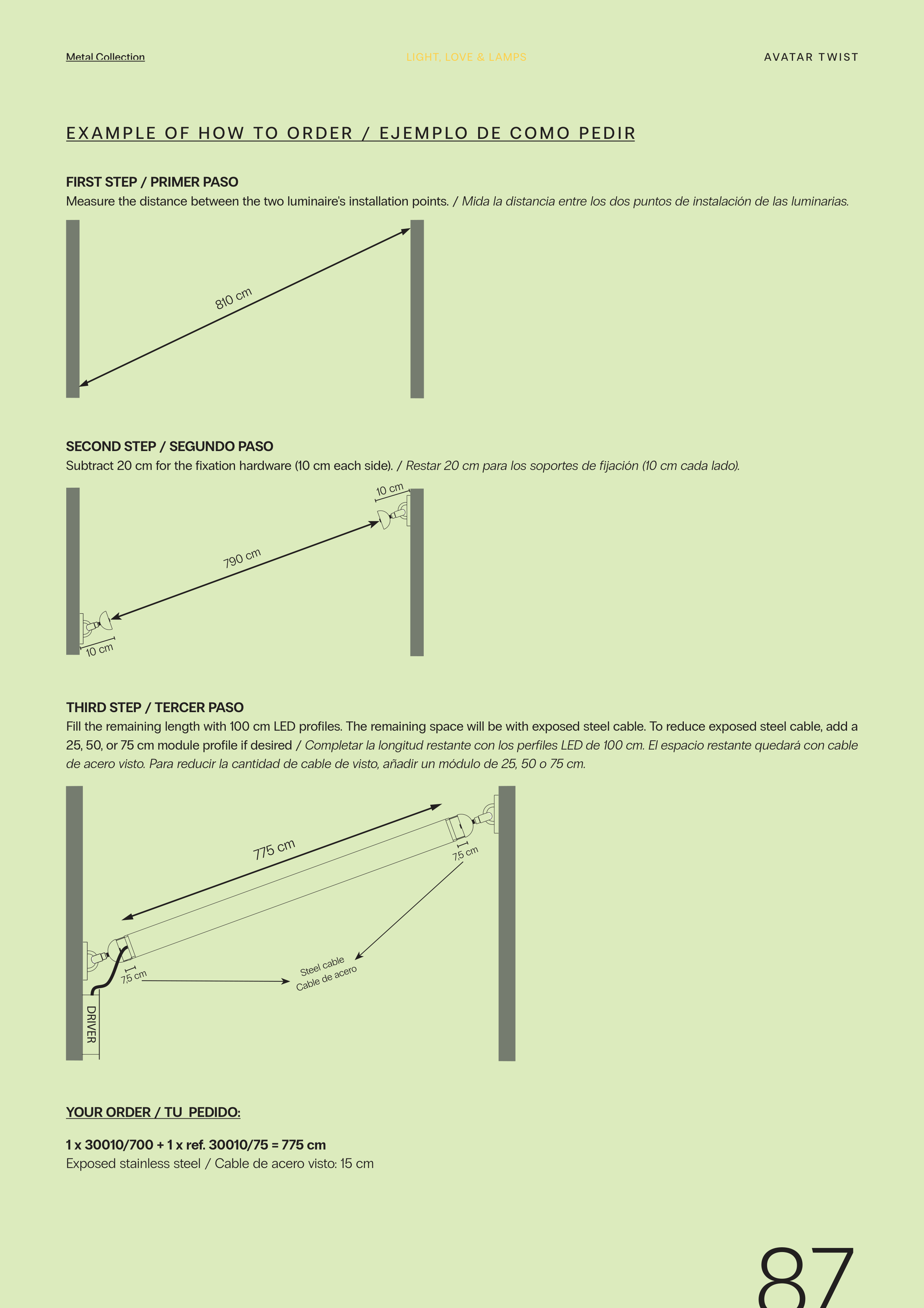 25, 50, or 75 cm module profile if desired / Completar la longitud restante con los perfiles LED de 100 cm. El espacio restante quedará con cable