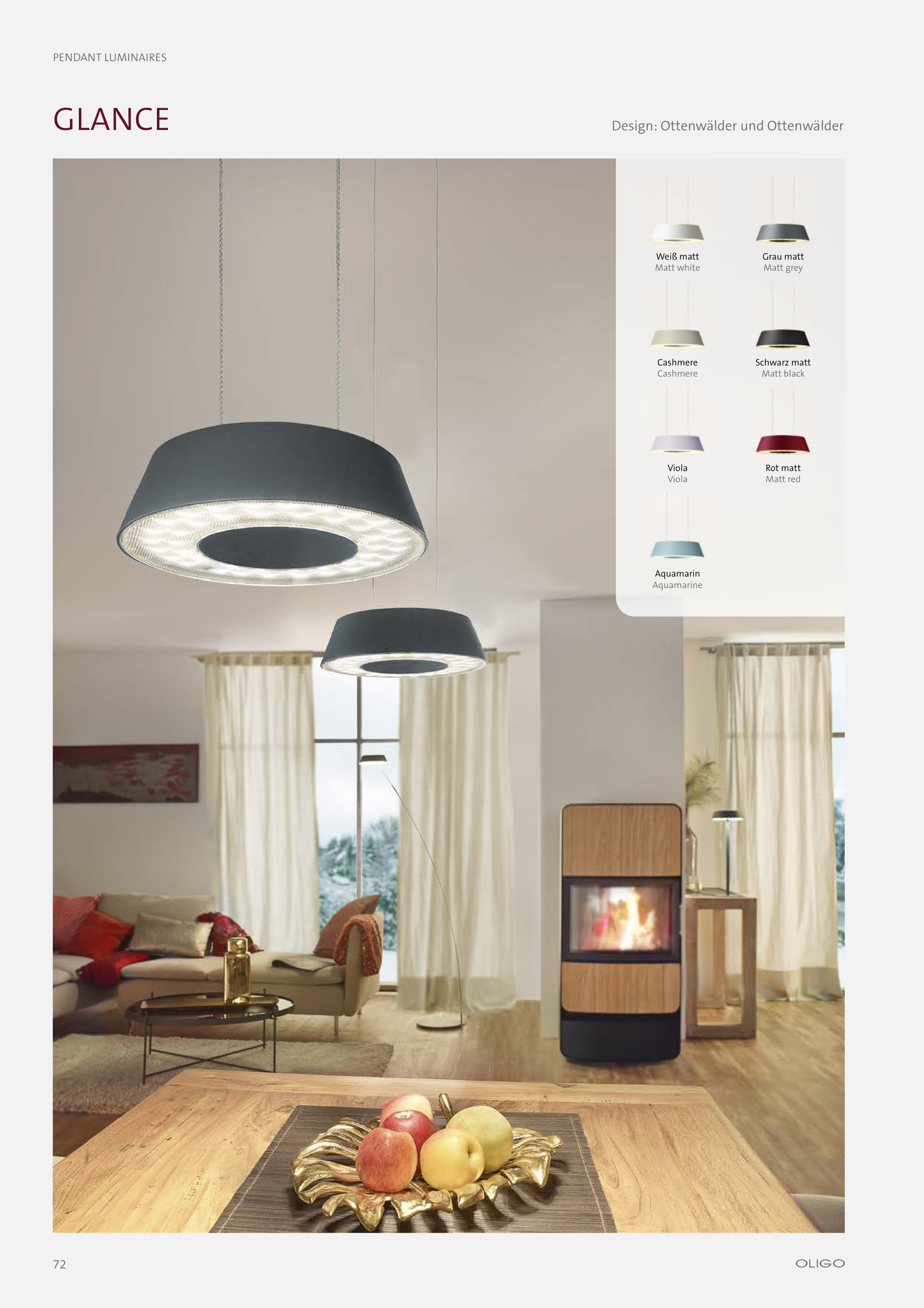 72 PENDANT LUMINAIRES GLANCE Design: Ottenwälder und Ottenwälder Weiß matt Matt white Grau matt Matt grey Cashmere Cashmere Schwarz matt Matt black Viola Viola Rot matt Matt red Aquamarin Aquamarine