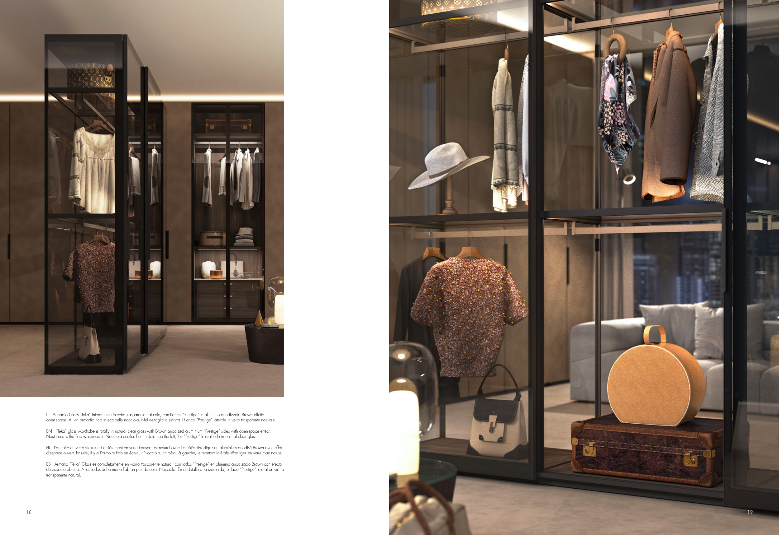 Next there is the Fab wardrobe in Nocciola eco-leather. In detail on the left, the “Prestige” lateral side in natural clear glass.