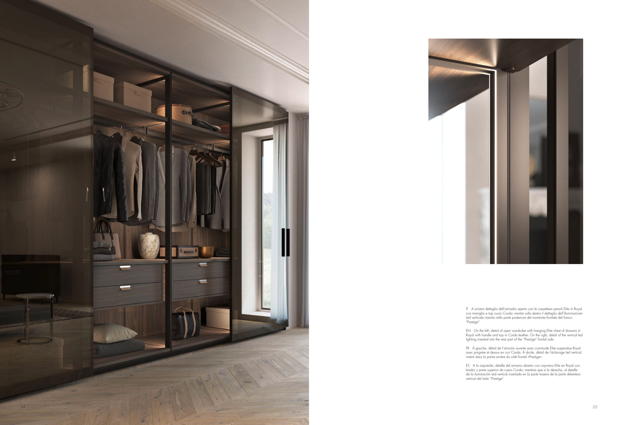 EN On the left, detail of open wardrobe with hanging Elite chest of drawers in