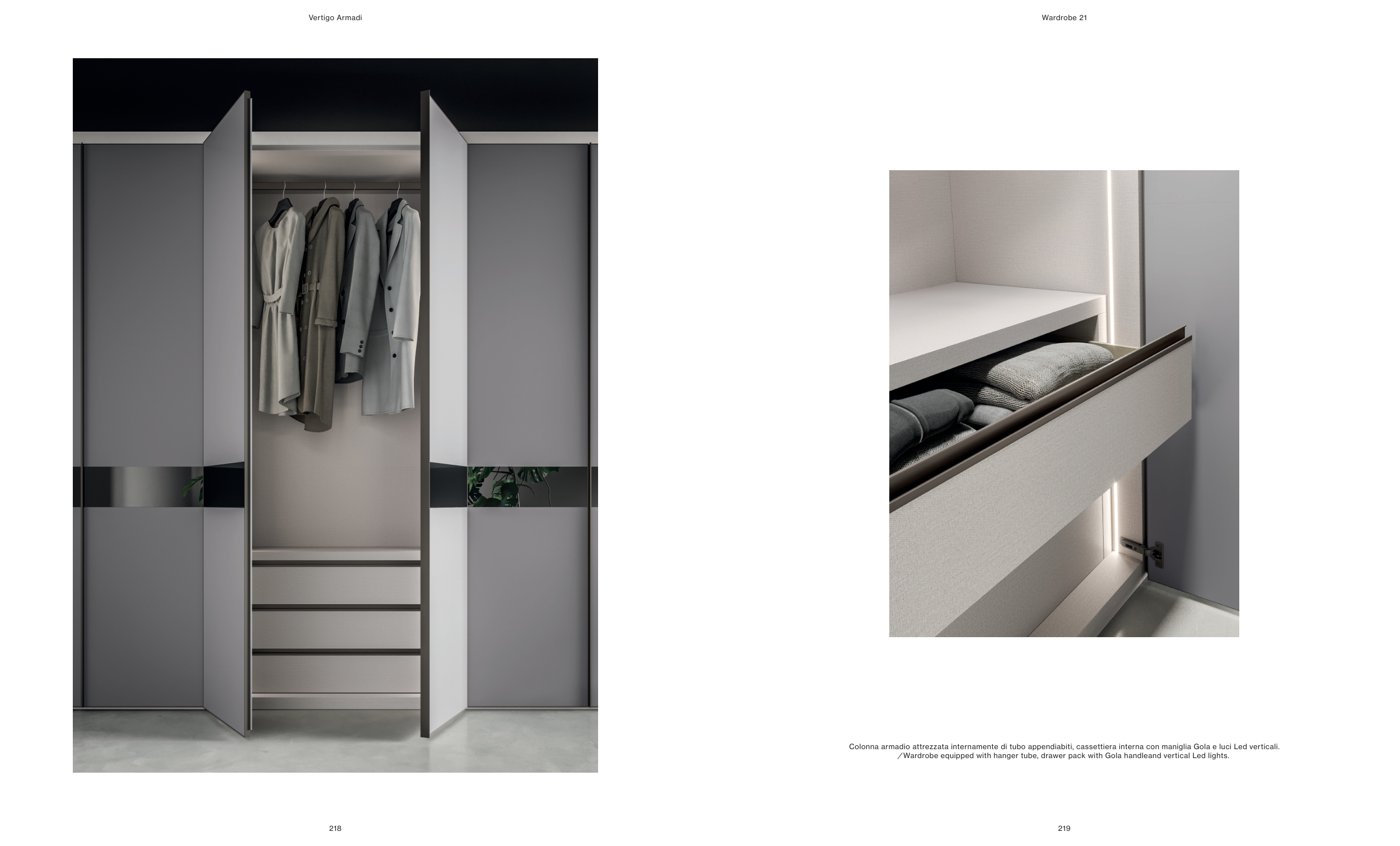 Colonna armadio attrezzata internamente di tubo appendiabiti, cassettiera interna con maniglia Gola e luci Led verticali. ⁄ Wardrobe equipped with hanger tube, drawer pack with Gola handleand vertical Led lights. 219 218 Vertigo Armadi Wardrobe 21