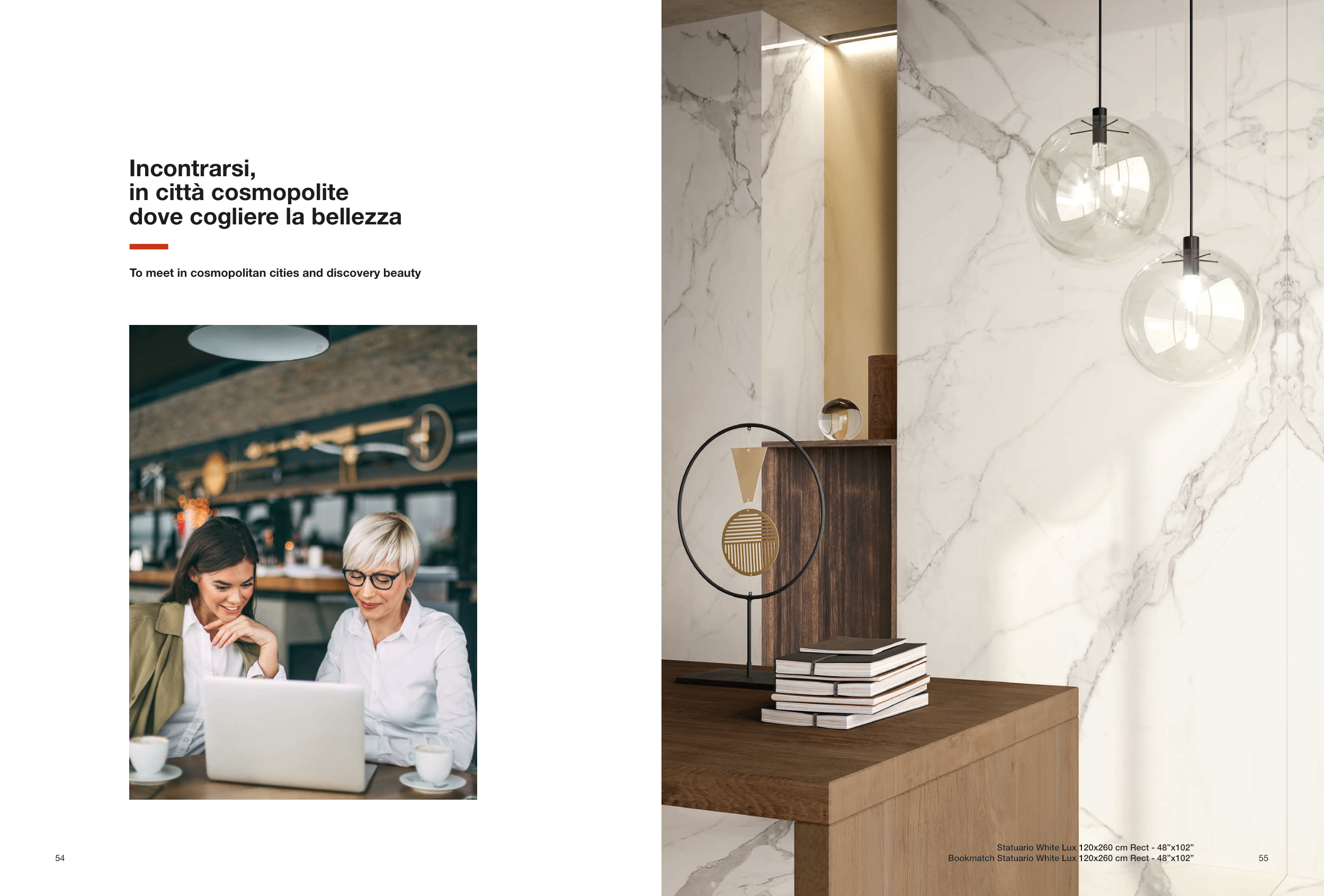 To meet in cosmopolitan cities and discovery beauty Incontrarsi, in città cosmopolite dove cogliere la bellezza Statuario White Lux 120x260 cm Rect - 48”x102” Bookmatch Statuario White Lux 120x260 cm Rect - 48”x102” 54 55