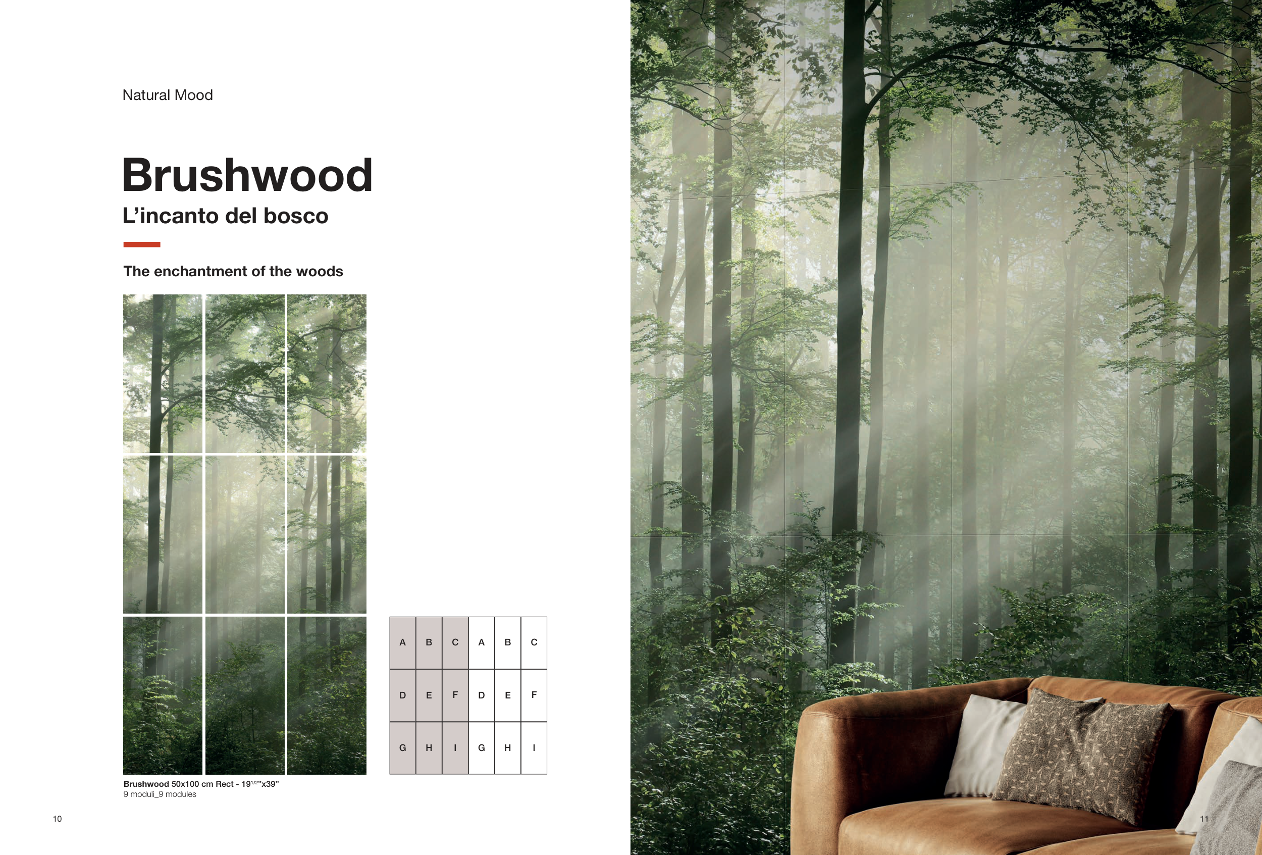 Brushwood L’incanto del bosco The enchantment of the woods Brushwood 50x100 cm Rect - 191/2”x39” 9 moduli_9 modules Natural Mood A A D D G G B B E E H H C C F F I I 10 11