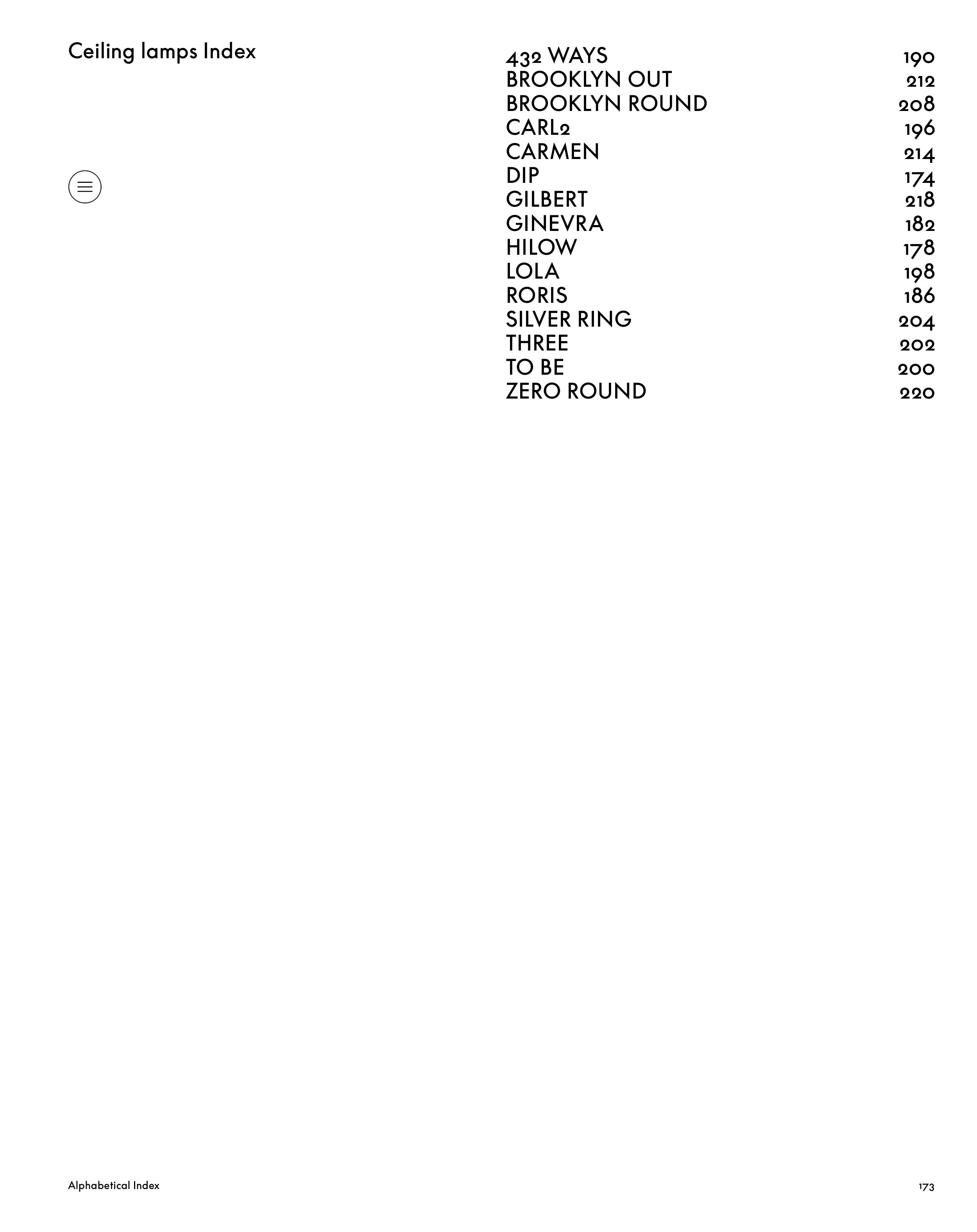 173 Ceiling lamps Index Alphabetical Index 432 WAYS 190 BROOKLYN OUT 212 BROOKLYN ROUND 208 CARL2 196 CARMEN 214 DIP 174 GILBERT 218 GINEVRA 182 HILOW 178 LOLA 198 RORIS 186 SILVER RING 204 THREE 202 TO BE 200 ZERO ROUND 220