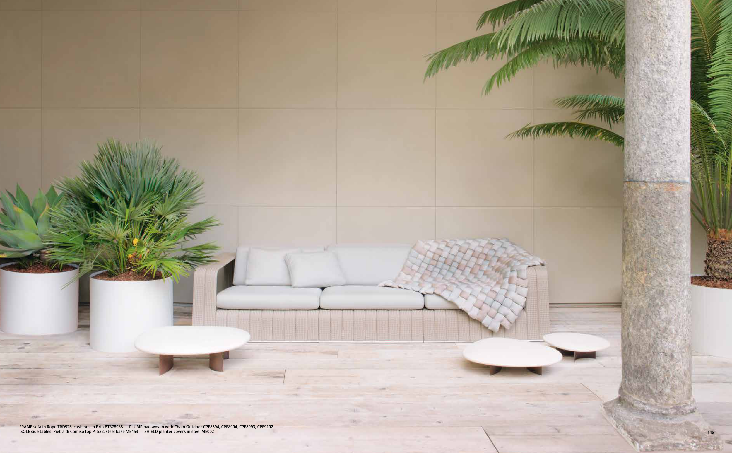 144 145 FRAME sofa in Rope TRD528, cushions in Brio BT378988 | PLUMP pad woven with Chain Outdoor CPE8694, CPE8994, CPE8993, CPE9192 ISOLE side tables, Pietra di Comiso top PT532, steel base ME453 | SHIELD planter covers in steel ME002