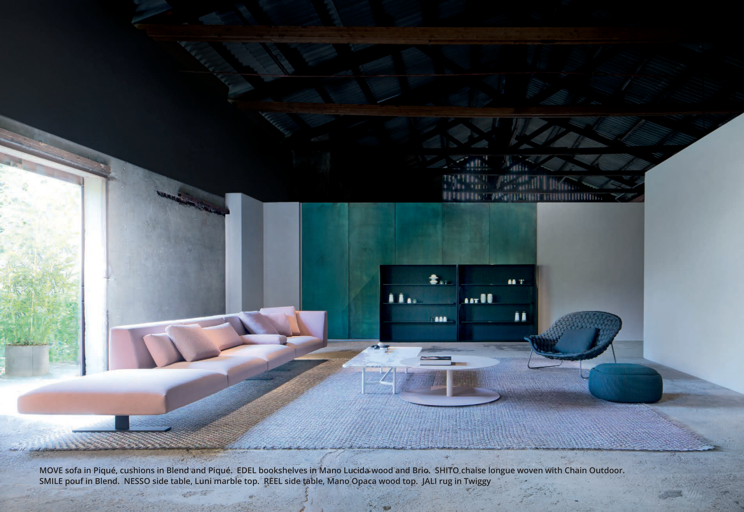 58MOVE sofa in Piqué, cushions in Blend and Piqué. EDEL bookshelves in Mano Lucida wood and Brio. SHITO chaise longue woven with Chain Outdoor.