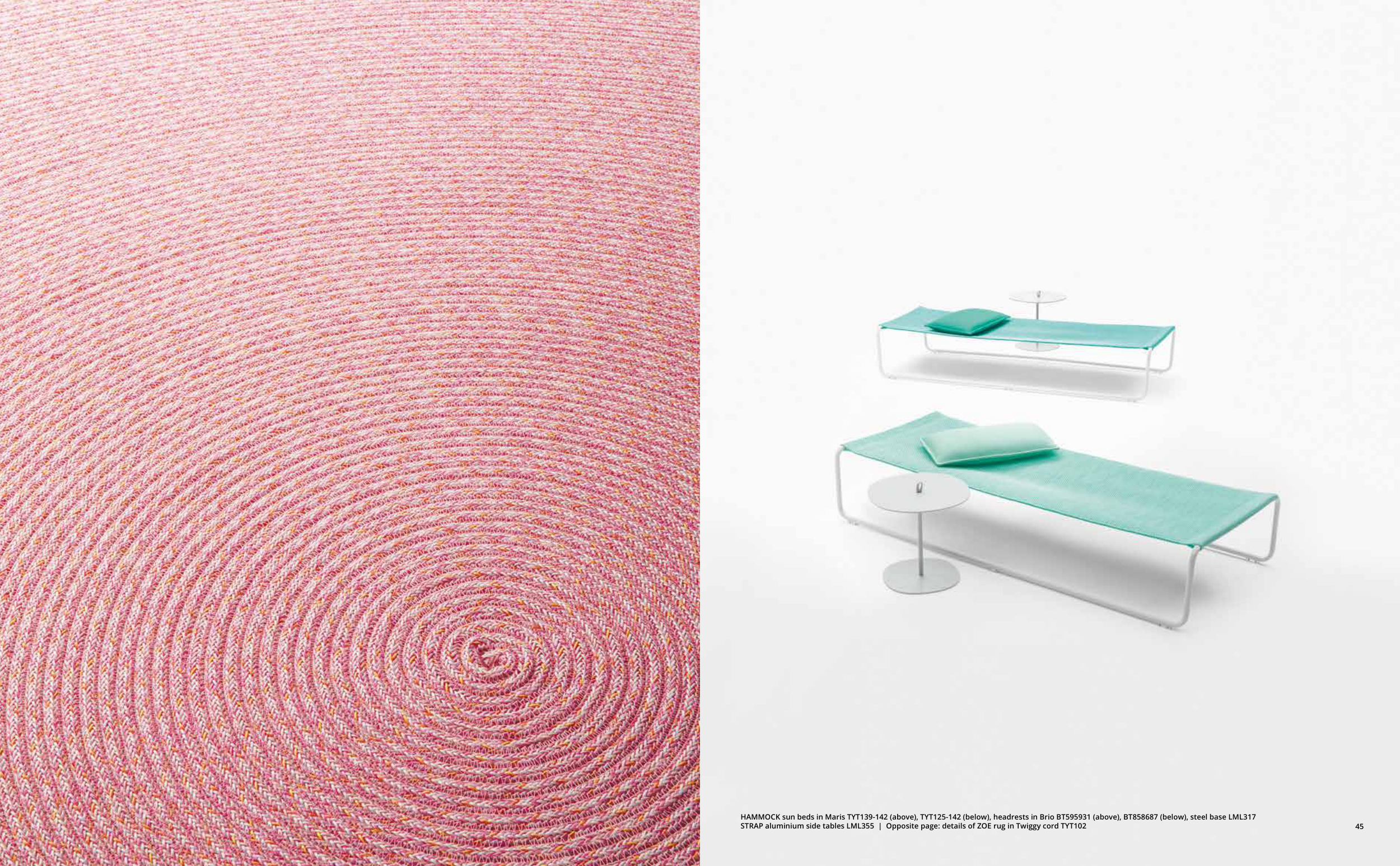 44 HAMMOCK sun beds in Maris TYT139-142 (above), TYT125-142 (below), headrests in Brio BT595931 (above), BT858687 (below), steel base LML317 STRAP aluminium side tables LML355 | Opposite page: details of ZOE rug in Twiggy cord TYT102 45