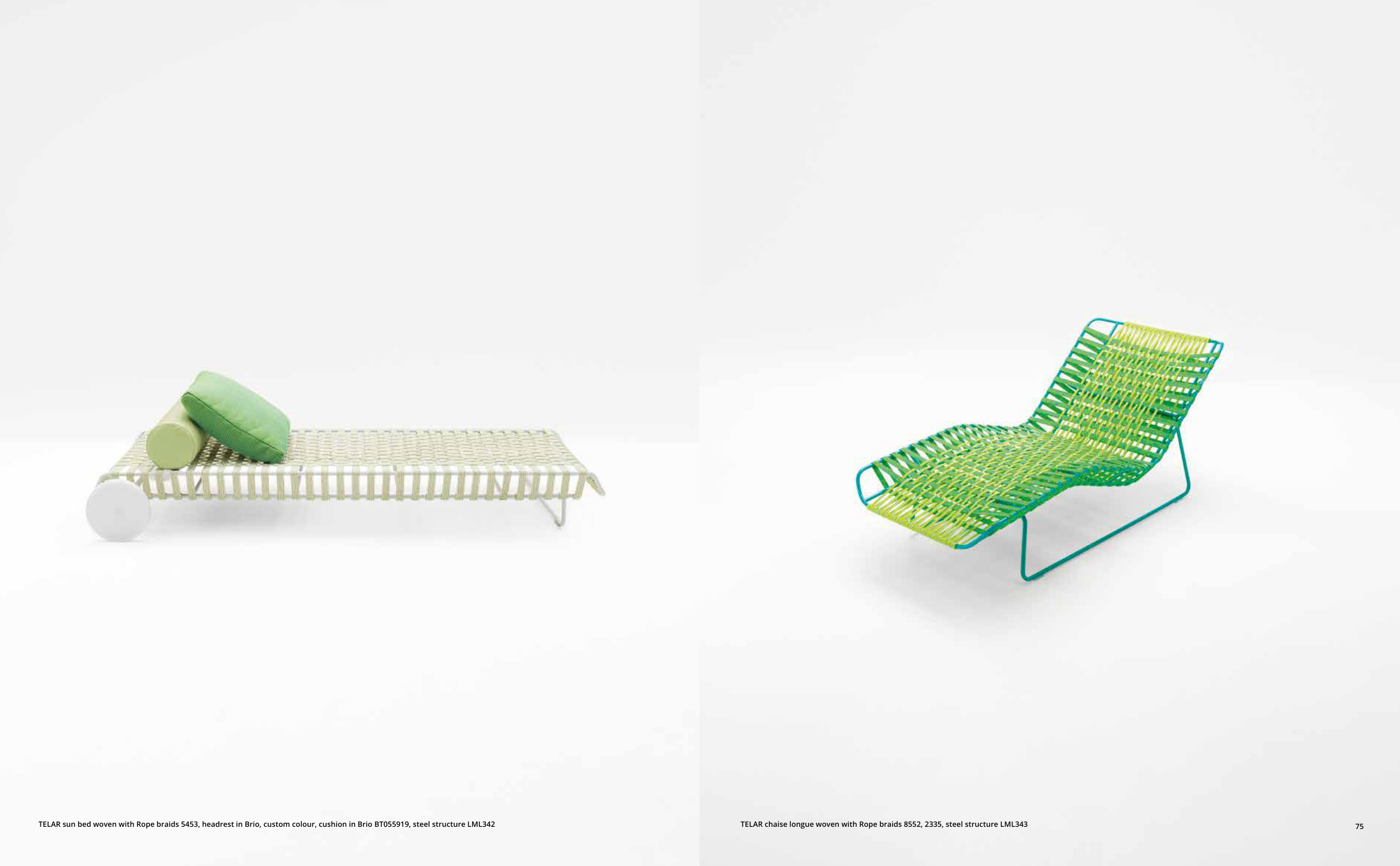 TELAR sun bed woven with Rope braids 5453, headrest in Brio, custom colour, cushion in Brio BT055919, steel structure LML342