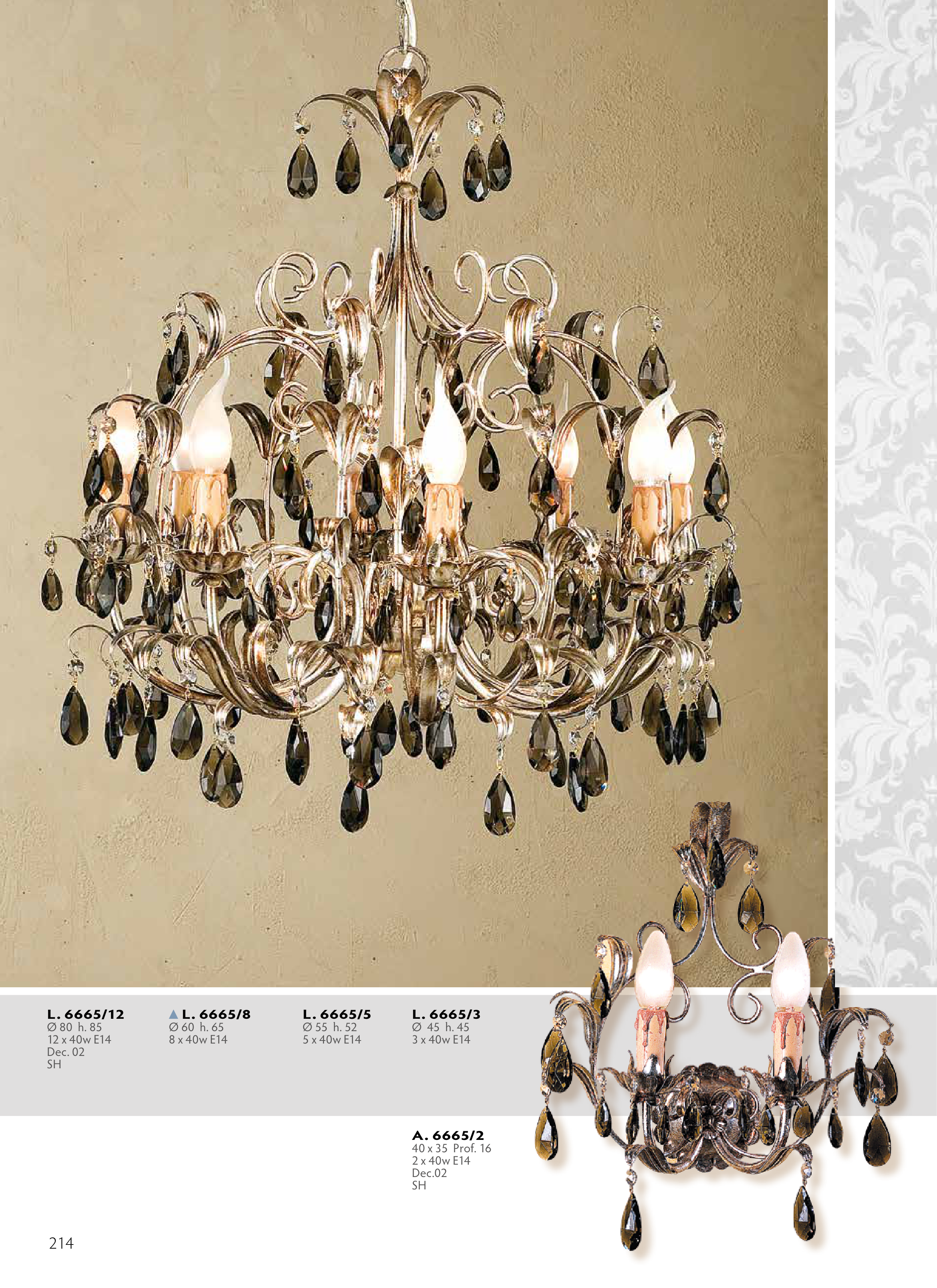 L. 6665/8 Ø 60 h. 65 8 x 40w E14 L. 6665/5 Ø 55 h. 52 5 x 40w E14 L. 6665/12 Ø 80 h. 85 12 x 40w E14 Dec. 02 SH L. 6665/3 Ø 45 h. 45 3 x 40w E14 A. 6665/2 40 x 35 Prof. 16 2 x 40w E14 Dec.02 SH 214