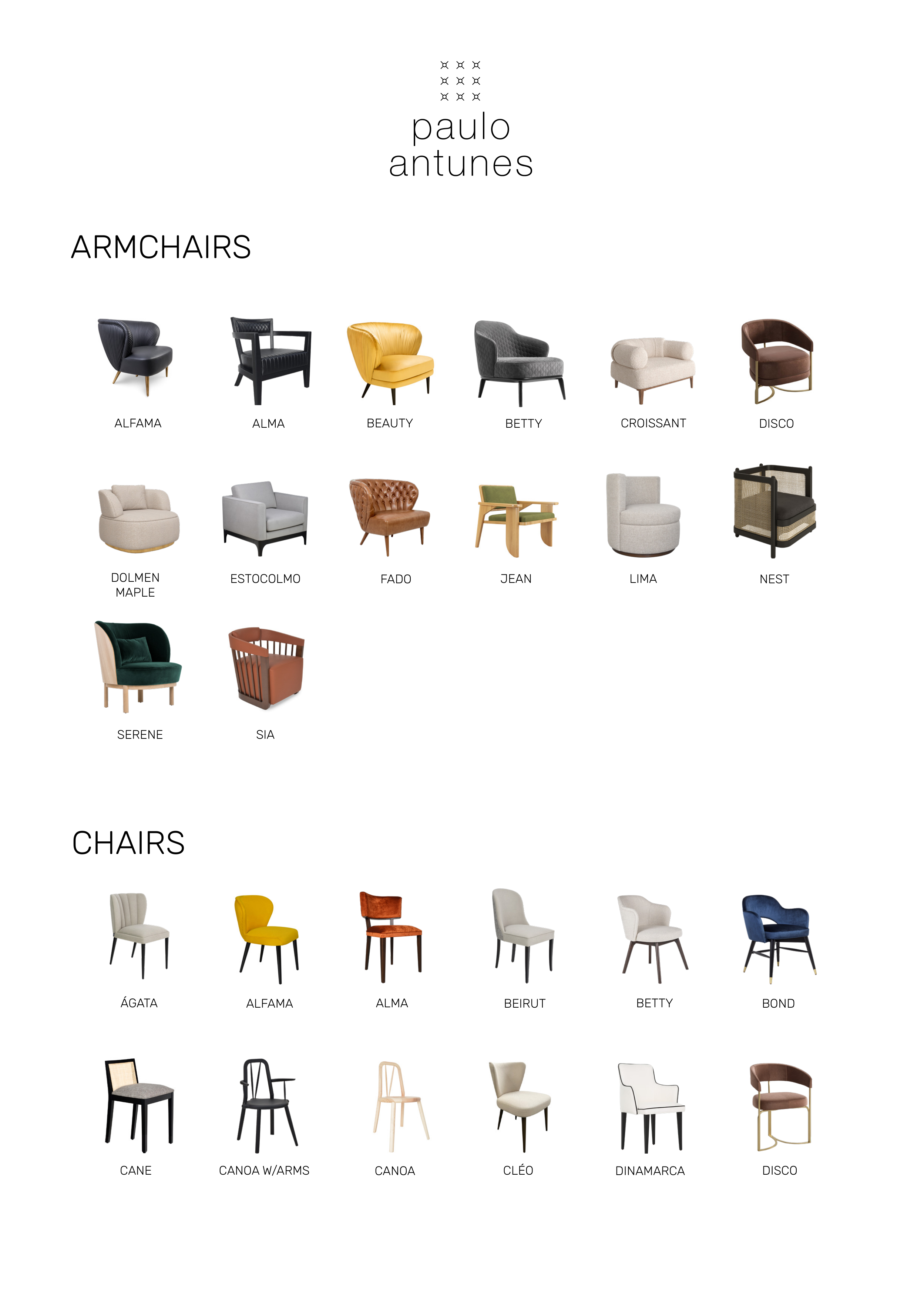 ARMCHAIRS ALFAMA ALMA BEAUTY BETTY CROISSANT DISCO ESTOCOLMO FADO LIMA NEST SERENE SIA CHAIRS ÁGATA ALFAMA ALMA BEIRUT BETTY CANOA W/ARMS CANOA CLÉO DINAMARCA DISCO JEAN DOLMEN MAPLE CANE BOND