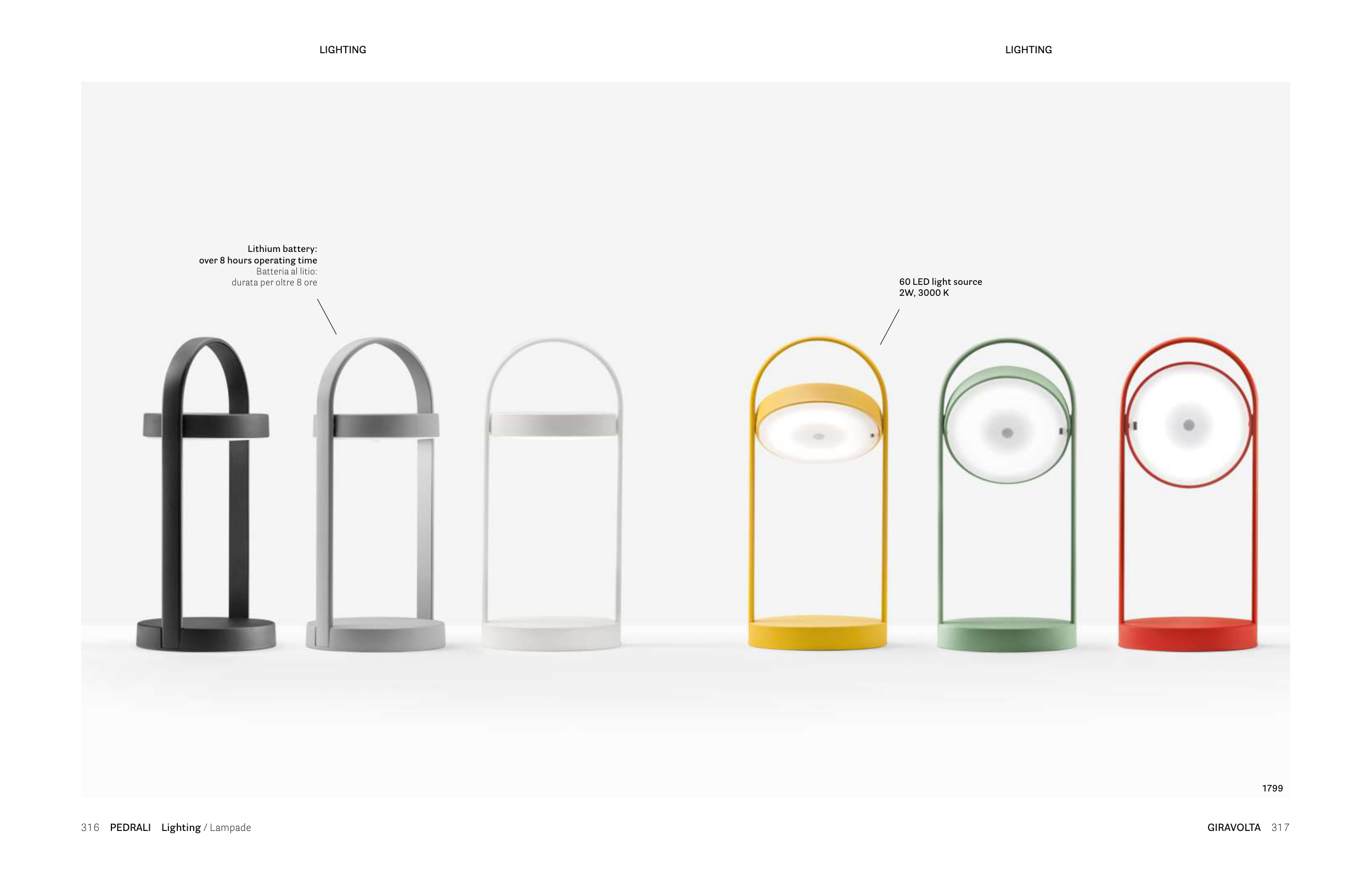 GIRAVOLTA 317 316 PEDRALI Lighting / Lampade Lithium battery: over 8 hours operating time Batteria al litio: durata per oltre 8 ore 1799 60 LED light source 2W, 3000 K LIGHTING LIGHTING