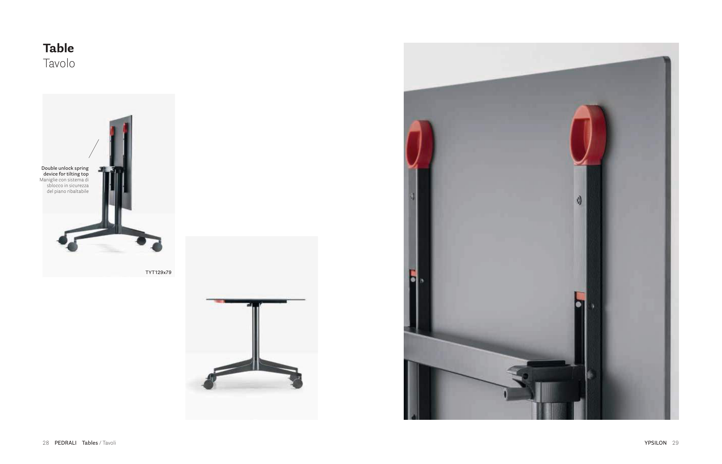 YPSILON 29 28 PEDRALI Tables / Tavoli Double unlock spring device for tilting top Maniglie con sistema di sblocco in sicurezza del piano ribaltabile Table Tavolo TYT129x79