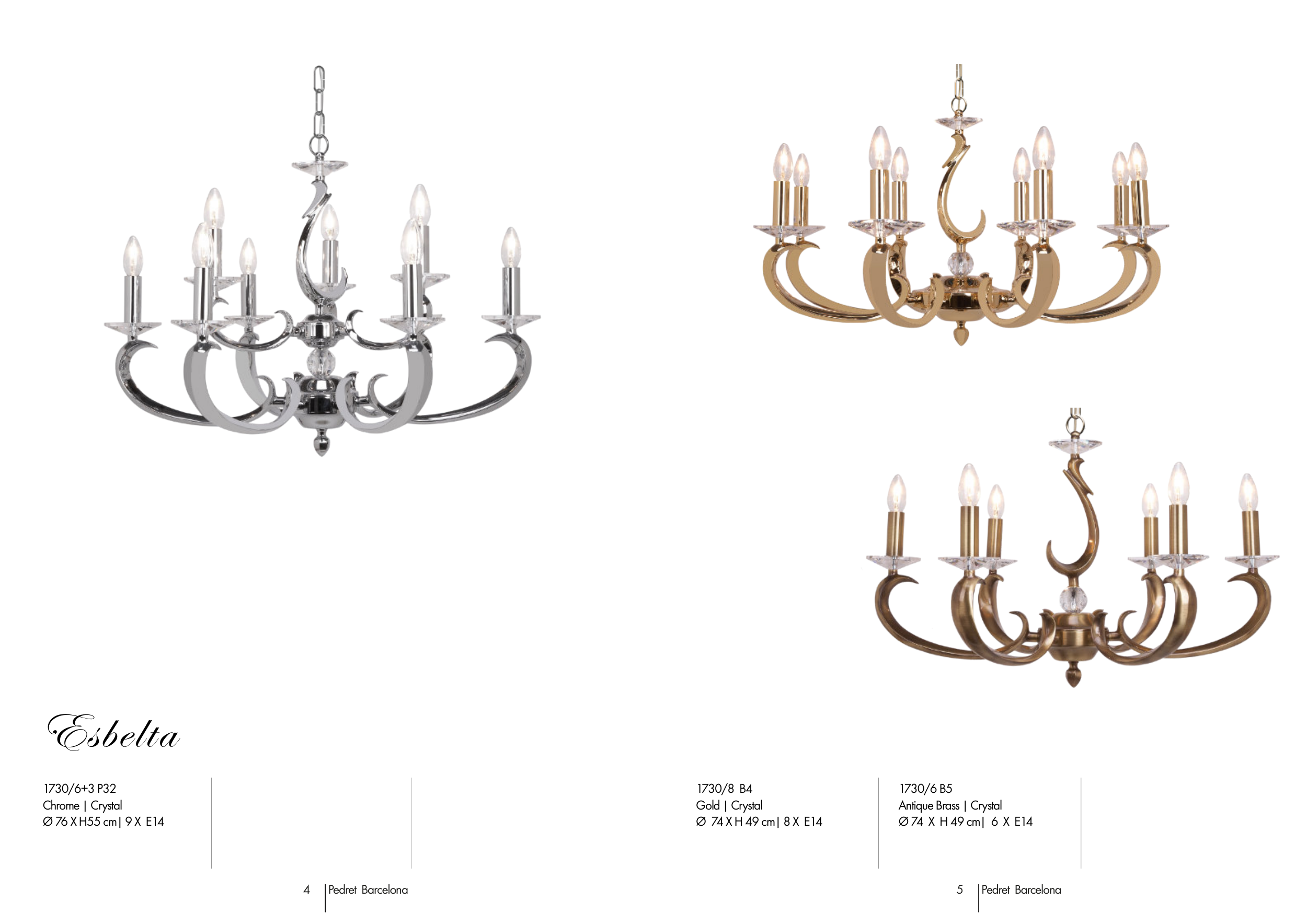 5 Pedret Barcelona 1730/6 B5 Antique Brass | Crystal Ø 74 X H 49 cm| 6 X E14 1730/8 B4 Gold | Crystal Ø 74 X H 49 cm| 8 X E14 4 Pedret Barcelona 1730/6+3 P32 Chrome | Crystal Ø 76 X H55 cm| 9 X E14 Esbelta