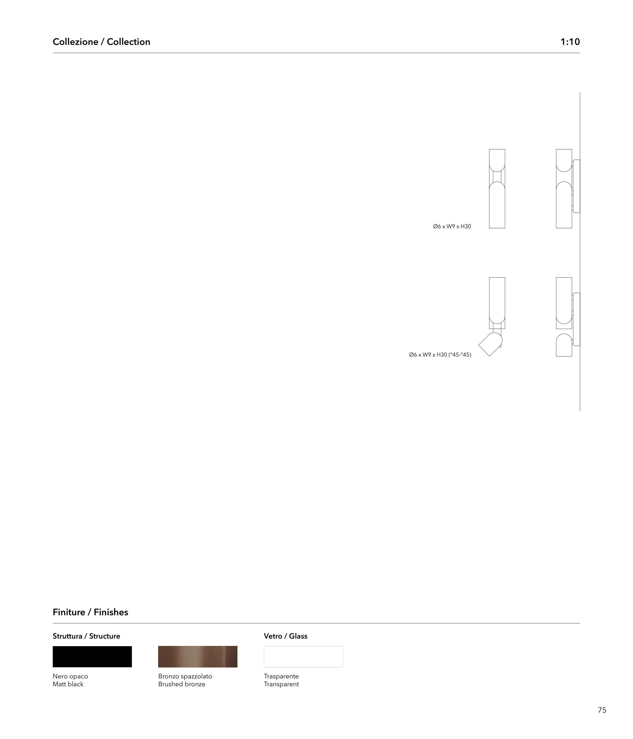 75 Ø6 x W9 x H30 Ø6 x W9 x H30 (°45-°45) 1:10 Trasparente Transparent Vetro / Glass Collezione / Collection Nero opaco Matt black Finiture / Finishes Struttura / Structure Bronzo spazzolato Brushed bronze