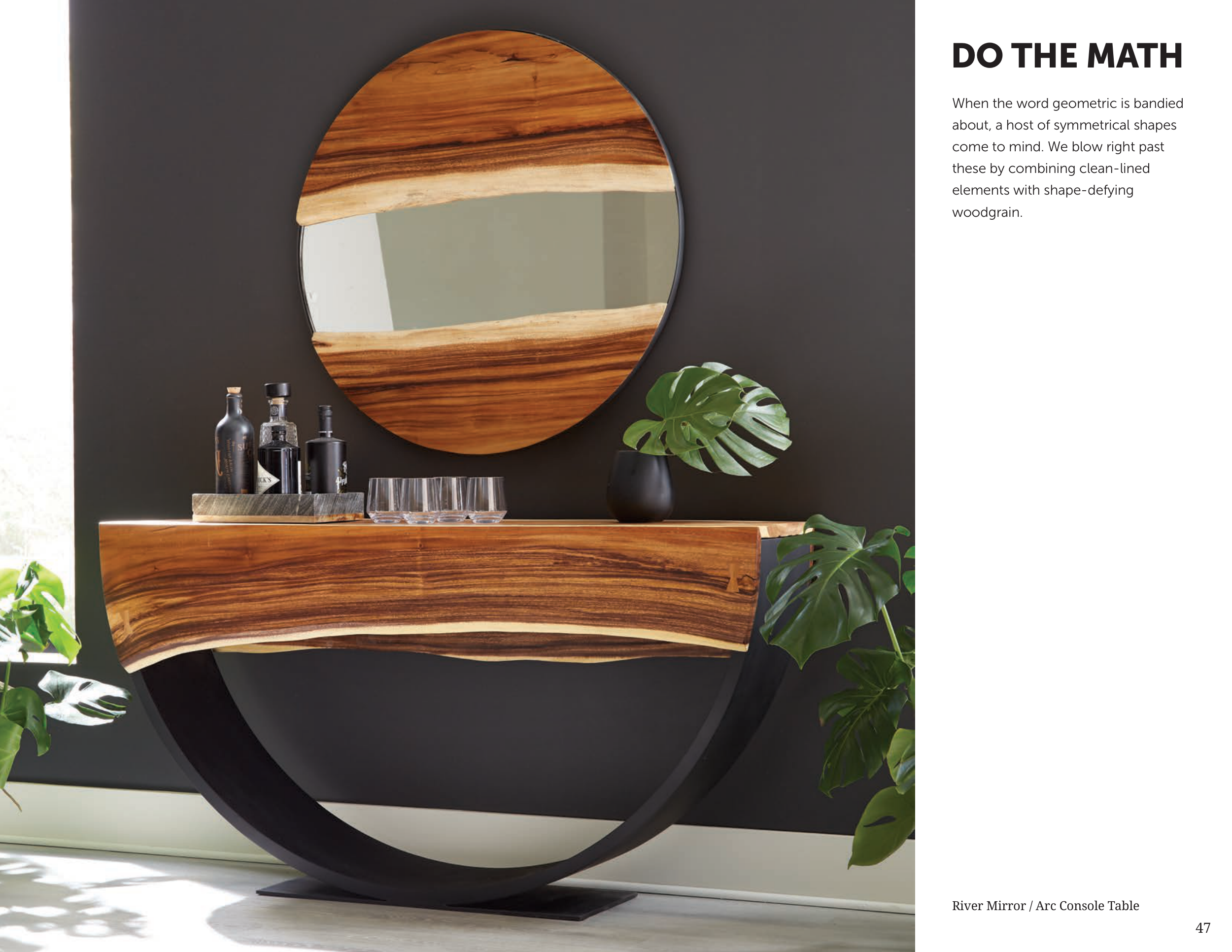 46 47 When the word geometric is bandied about, a host of symmetrical shapes come to mind. We blow right past these by combining clean-lined elements with shape-defying woodgrain. River Mirror / Arc Console Table DO THE MATH