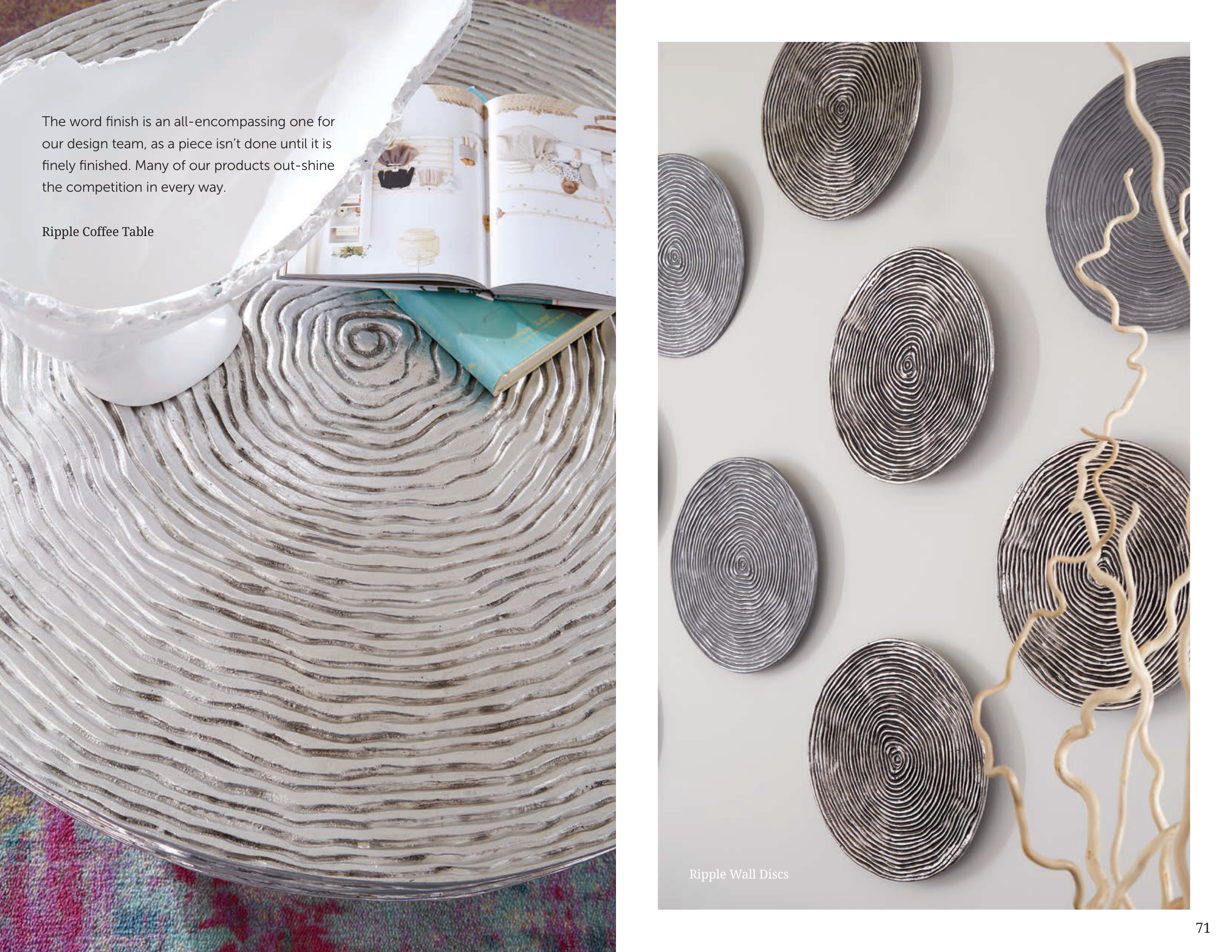 70 71 Ripple Wall Discs The word finish is an all-encompassing one for our design team, as a piece isn’t done until it is finely finished. Many of our products out-shine the competition in every way. Ripple Coffee Table