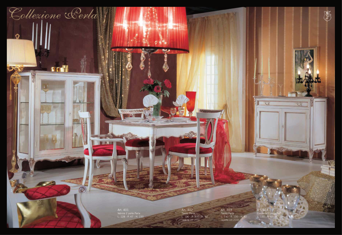 2 Art. 401 Vetrina 2 porte Perla L. 128 - P. 47 - H. 150 3 Collezione Perla Art. 402 Tavolo Perla L. 190 - P. 100 - H. 82 (aperto cm 270) Art. 403 Tavolo Perla L. 130 - P. 130 - H. 82 (aperto cm 210) Art. 404 Credenza 2 porte Perla L. 130 - P. 60 - H. 107
