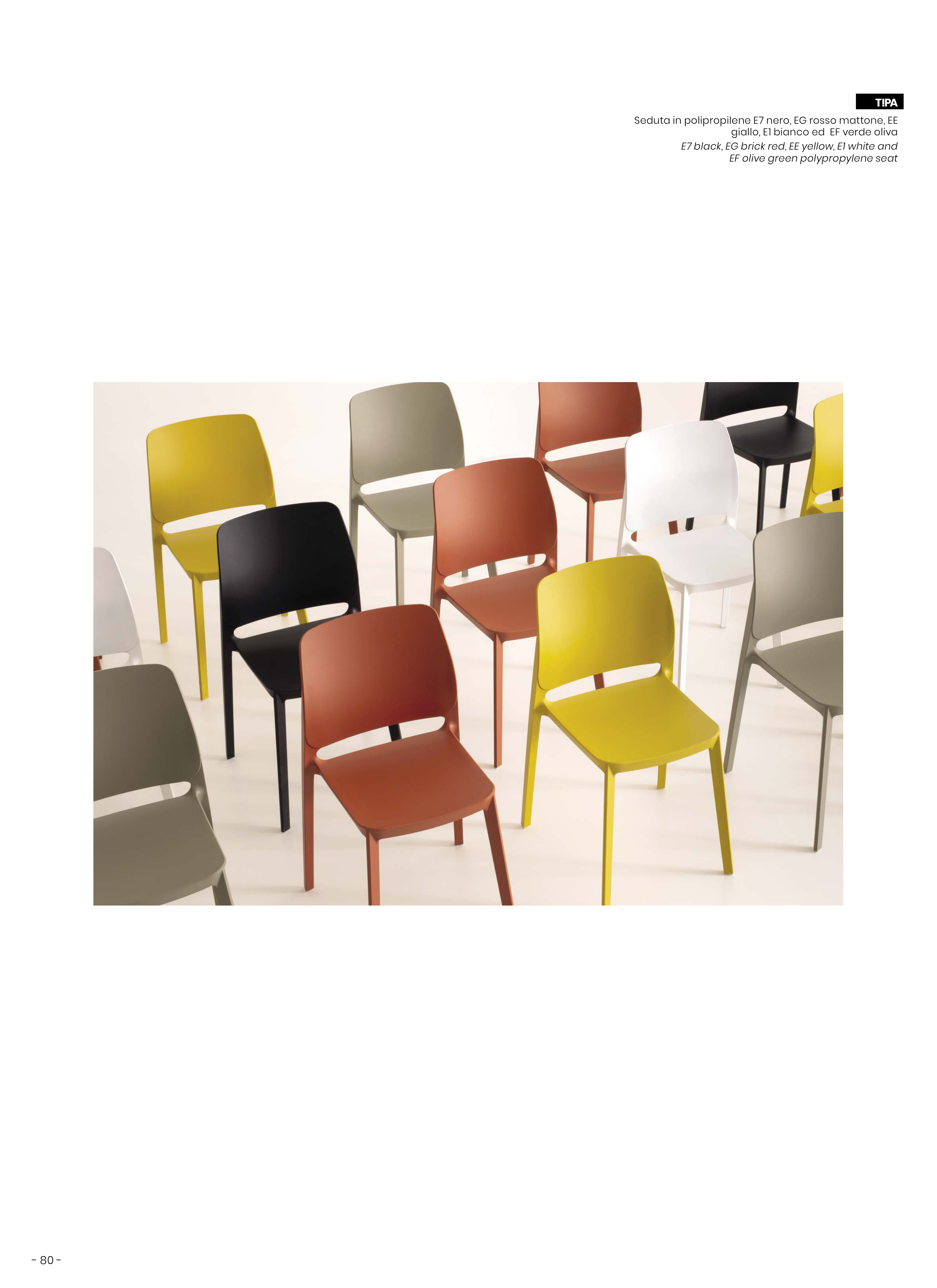 - 80 - Seduta in polipropilene E7 nero, EG rosso mattone, EE giallo, E1 bianco ed EF verde oliva E7 black, EG brick red, EE yellow, E1 white and EF olive green polypropylene seat
