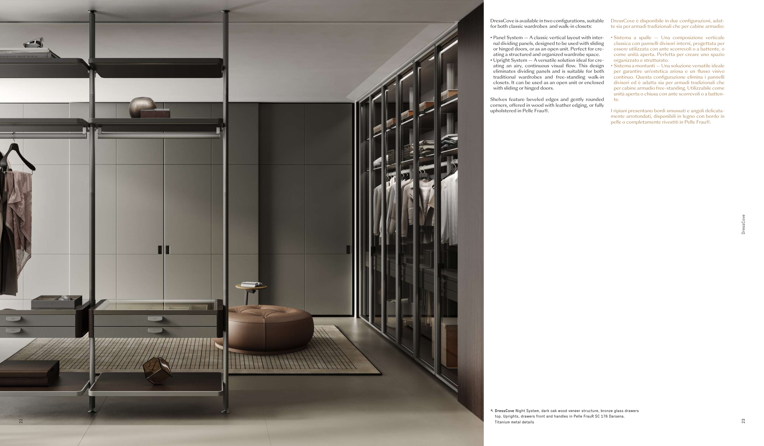 ↖ DressCove Night System, dark oak wood veneer structure, bronze glass drawers